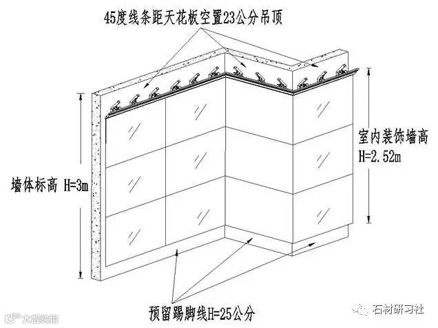 1、上图所示是以薄板和45度线条的一种干挂装饰效果,有阴角和阳角;