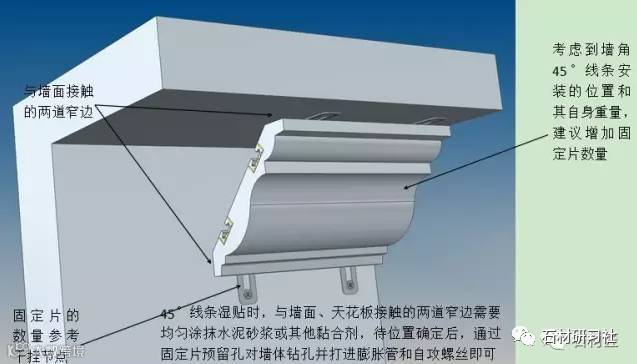 2、平面上的线条干挂与薄板干挂方法一致,所以不做说明,对于小号线条(0~25mm宽)则可以利用黏贴方法,因为小号线条自重轻;