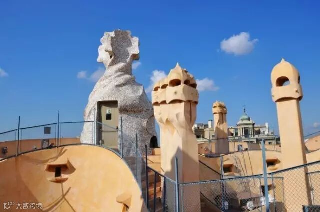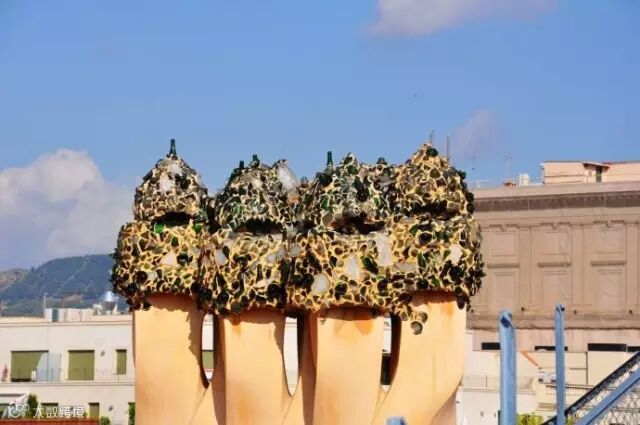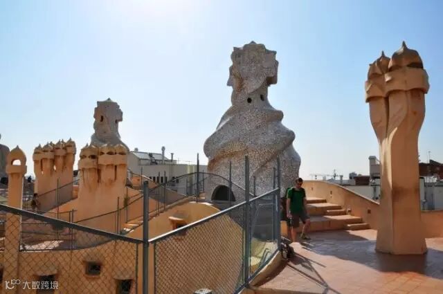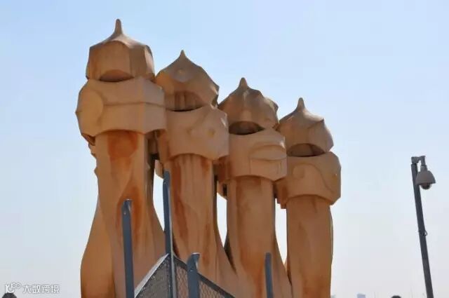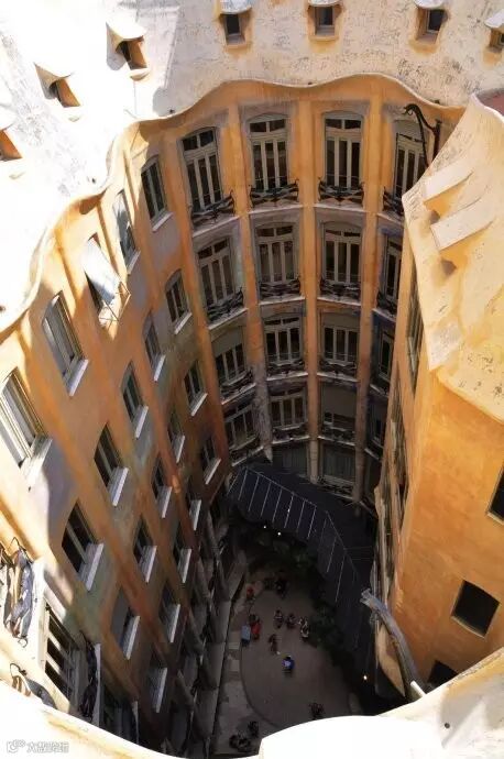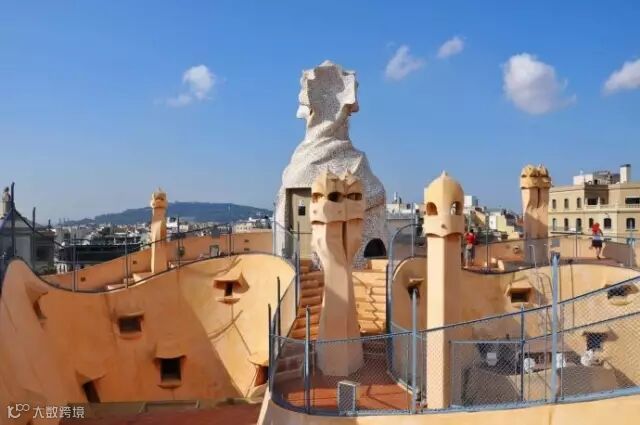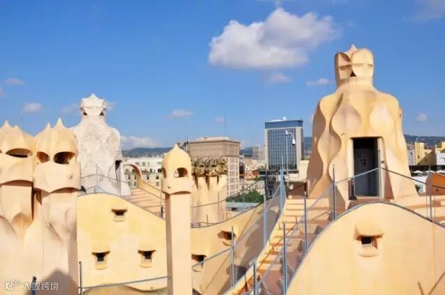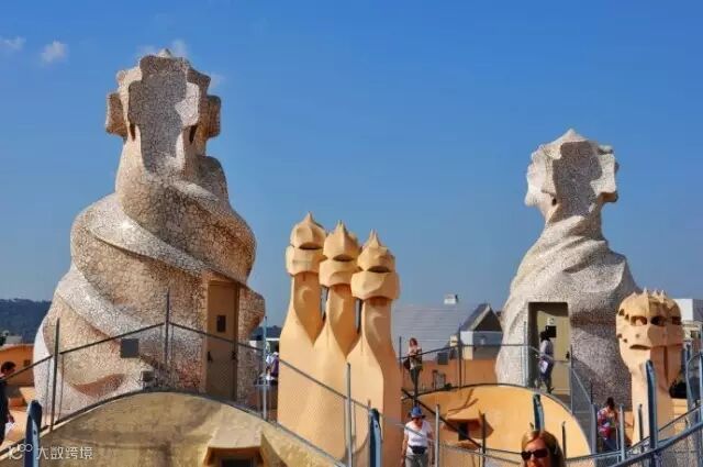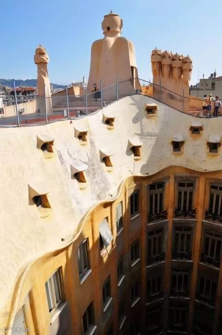 米拉公寓屋顶高低错落,而整栋建筑如波涛汹涌的海面,极富动感。屋顶是奇形怪状突然物做成的烟囱和通风管道。米拉公寓里里外外都显得非常怪异,甚至有些荒诞不经,该建筑无一处是直角,这也是高迪作品的最大特色,因为高迪认为:“直线属于人类,而曲线归于上帝。”