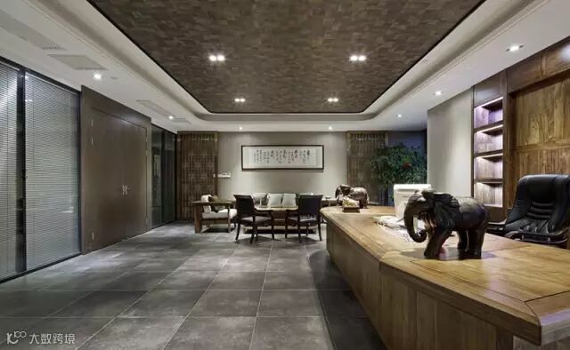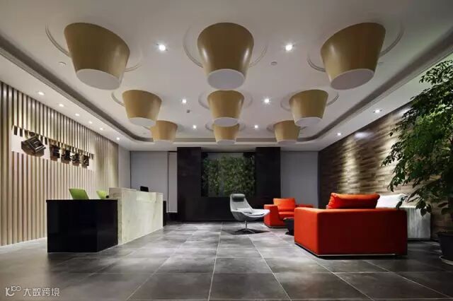 办公室前厅设计了九个圆锥形顶,和白色顶相互印衬,具有很强的视觉感染力。简约时尚的前台,在“黑”与“白”之间印衬着背景“木”,精致而有气度。沙发背景用了三拼艺术地板上墙,和大红色沙发在一起,极具有一种休闲的味道,打破了一般办公室严谨而又沉闷的办公氛围。