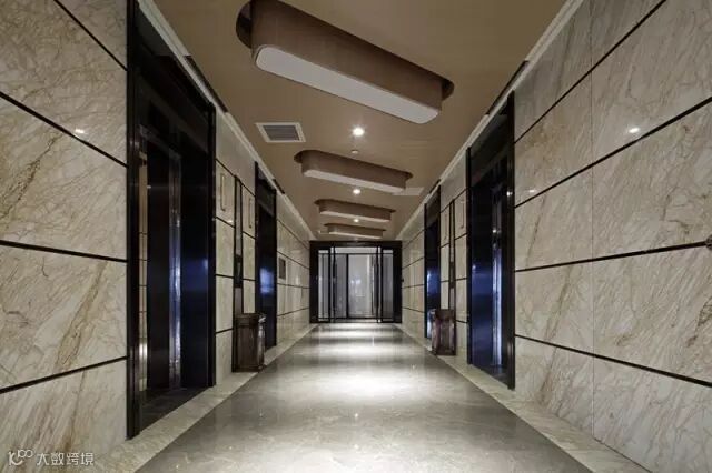 电梯厅墙面以米色石材为主,配上顶部原木色木饰面造型,和地面灰色石材搭起来相得益彰。