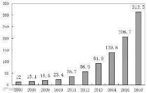 从历史数据看,2014年,我国快递业务量首次突破100亿件,超过美国跃居全球第一。2015年我国快递业继续以45%以上的增长势头,突破年业务量200亿件大关。2016年突破300亿件,同比增长53%。