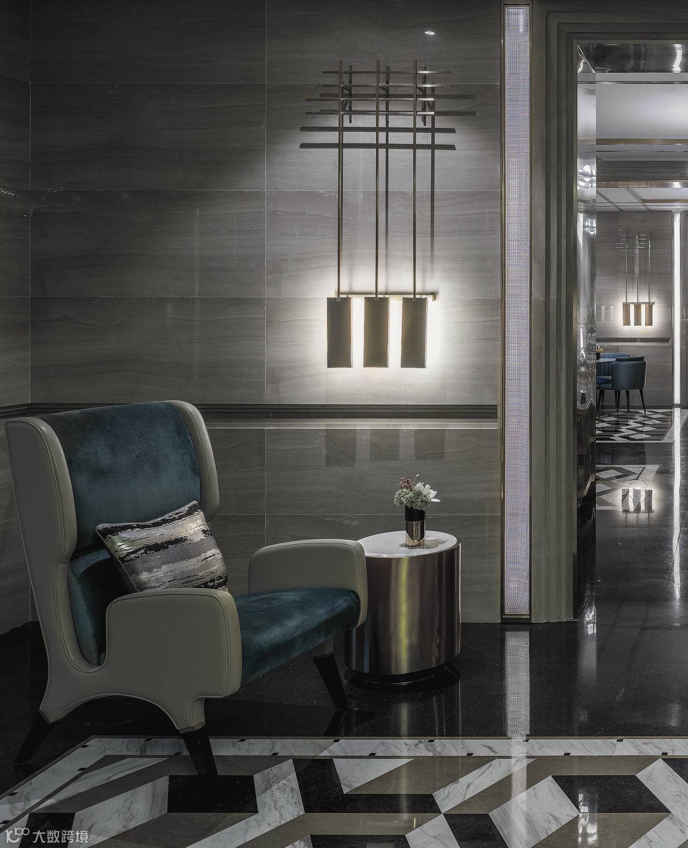 VIP休息区,满足客户的等候和休息的区域,更体现了人文关怀、通过门洞进入到一个横向的走廊,廊道左边可以看到墙面通过金属网的灯带依次延伸,墙面的层次更丰富。