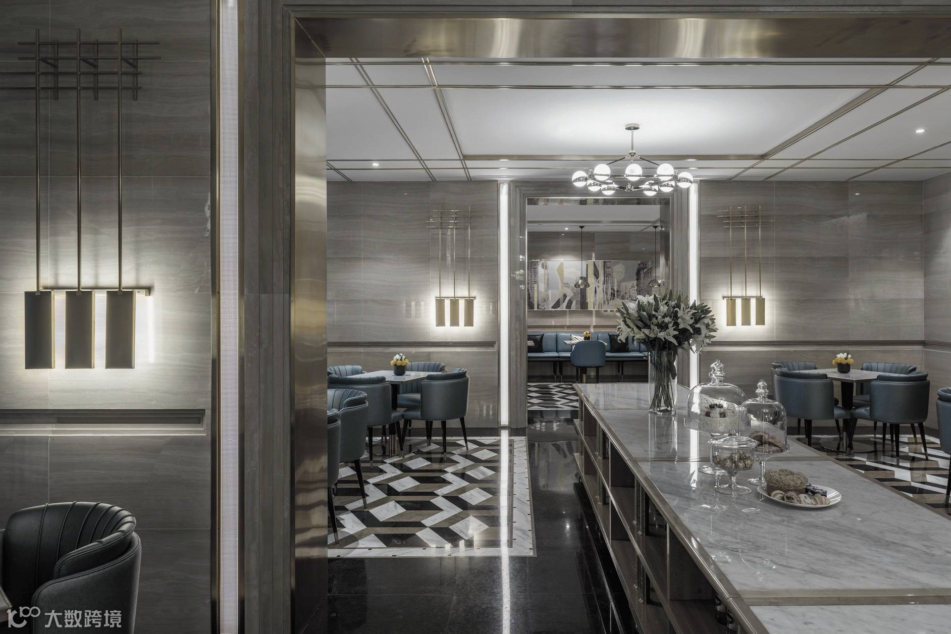 早餐吧和行政酒廊,空间景深比较深,设计师在此建筑结构基础上,做了空间层次上的叠加,石材叠级门套不锈钢收口,和灯带金属网结合细节做法也在重复延续,给人一种空间套空间的延伸感,增加了空间趣味性,灯光透过金属网散出光晕柔和的洒在顶面,使得空间层次更加丰富。