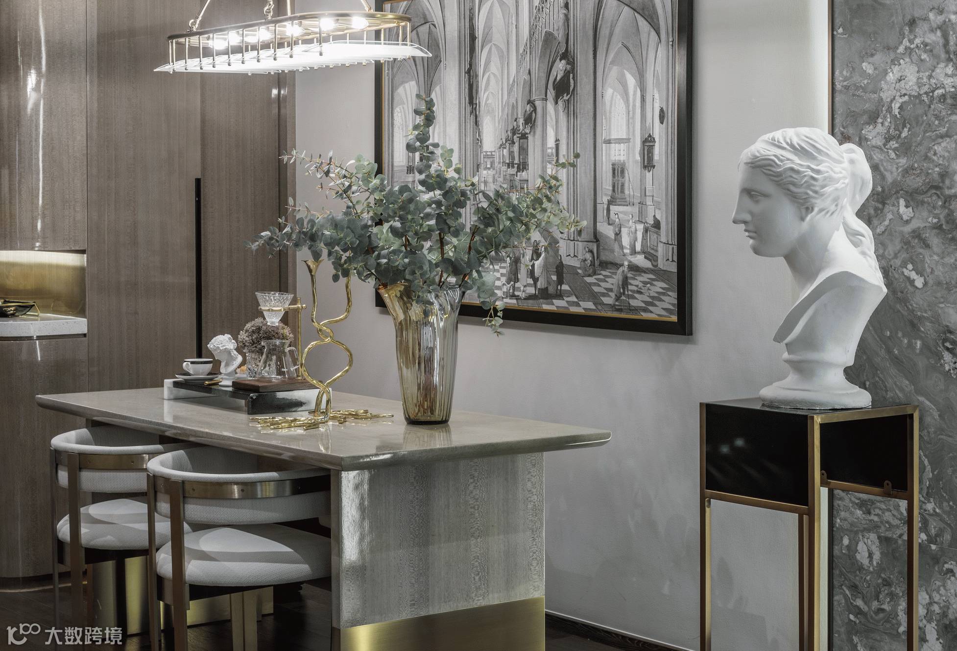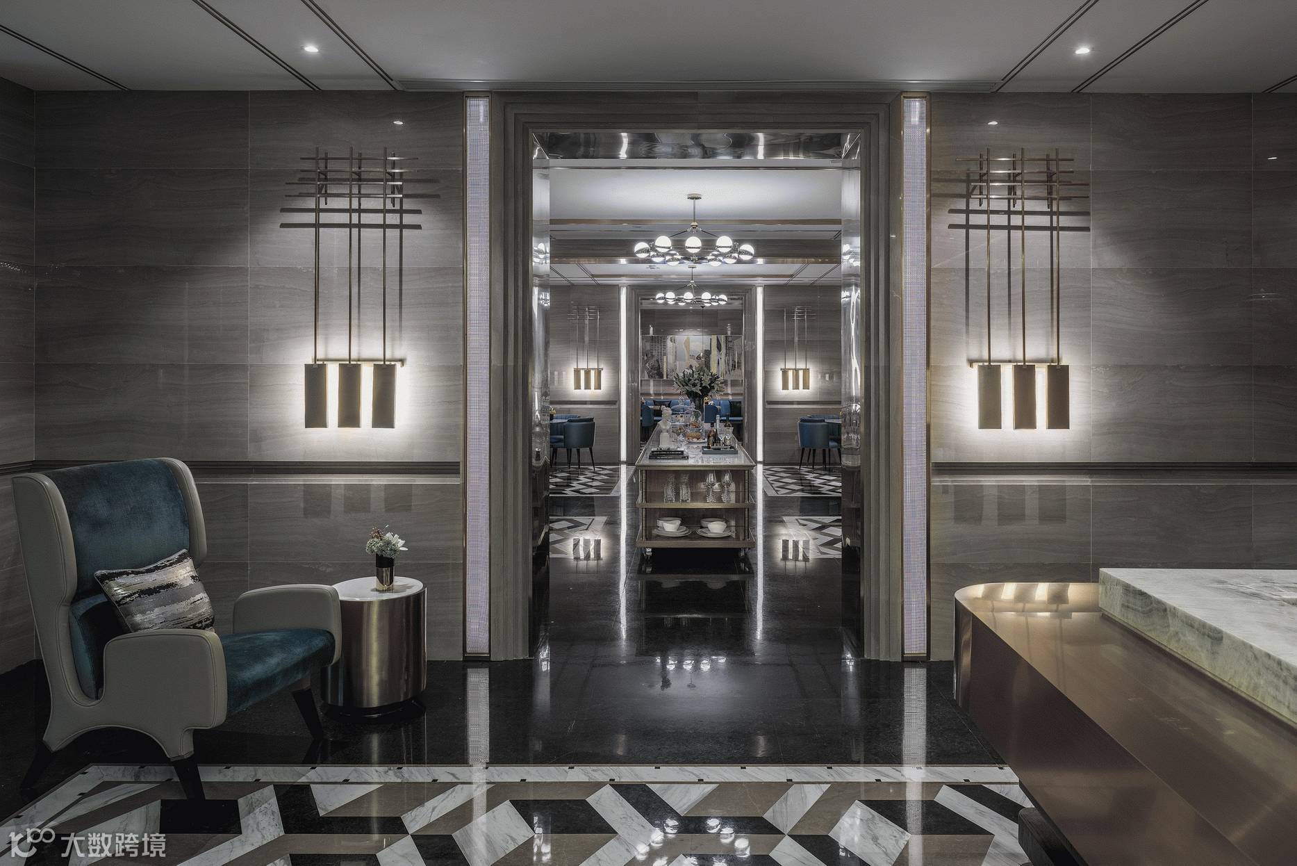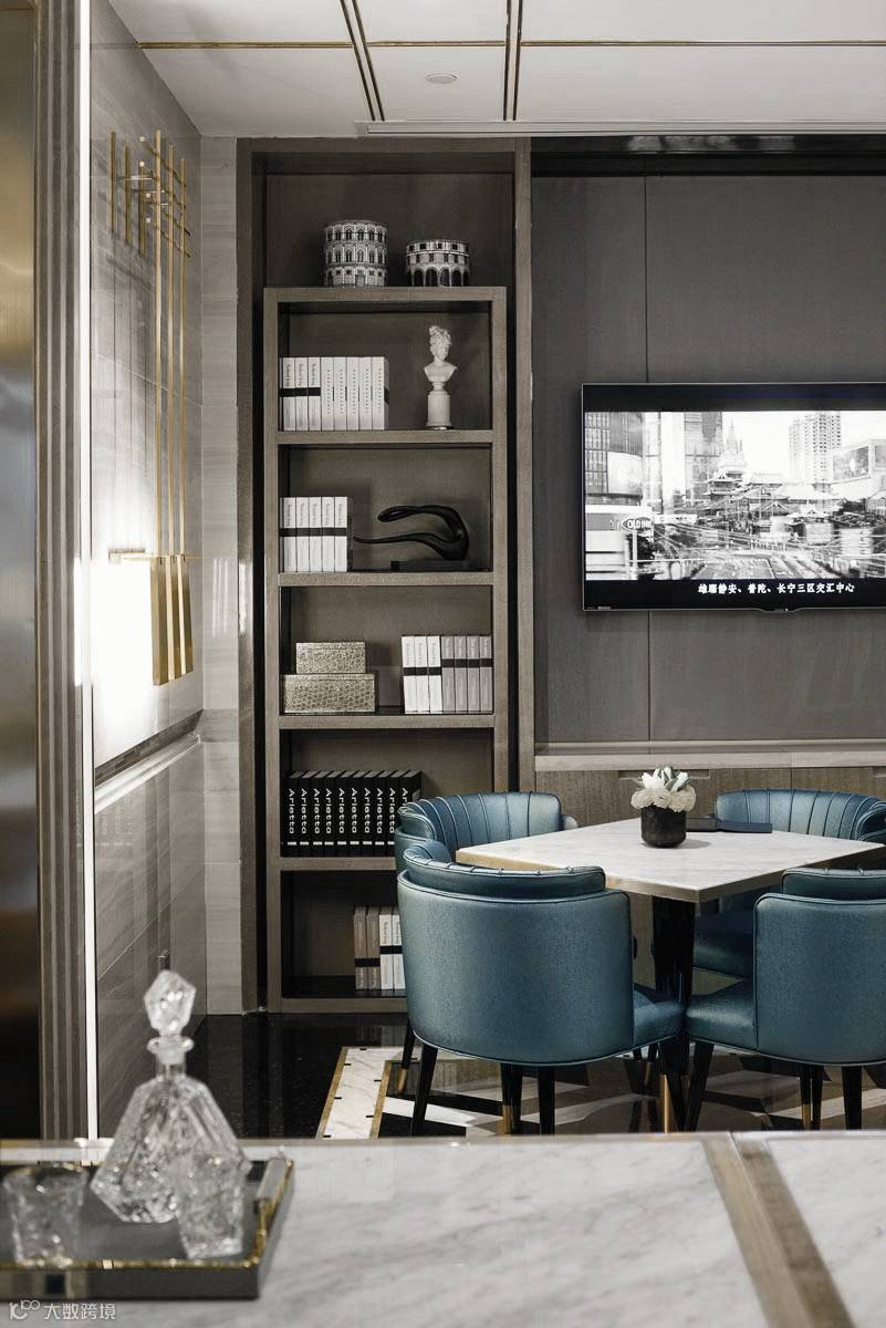 后现代形式的奢华尊贵的接待台,背景墙是层级叠加石材线条框套,内嵌见证着上海发展的“外白渡桥”装饰挂画,年逾百岁的外白渡桥默默承载着城市的荣辱,在许多海外游子心中,外白渡桥的身影却已化成一缕抹不去的乡愁,以这样一种主背景的形式拉近与客户之间的距离,产生一种心灵上的共鸣。