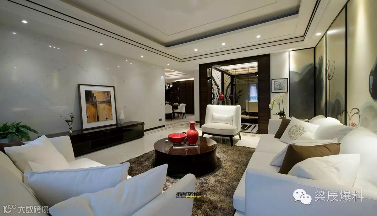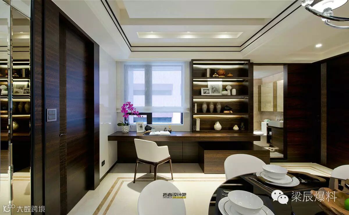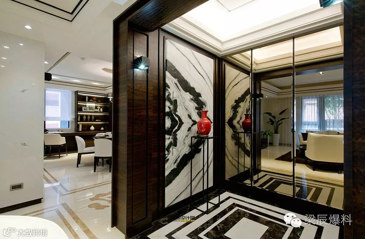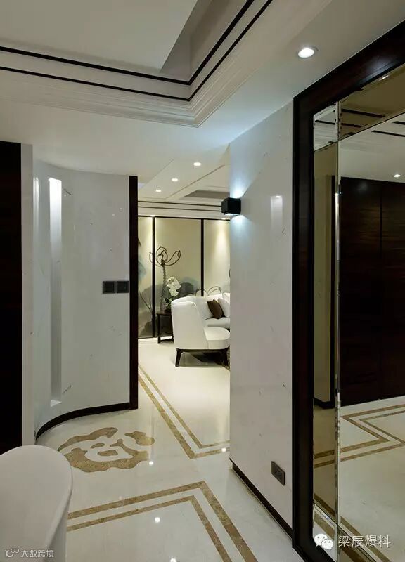 渐层内缩的黑白方框地坪,与水波纹向外扩散的端景墙线条,在鞋柜门片的镜射倒影中,放大玄关尺度,IS国际设计将擅长的石材艺术带入公共空间,纹理细緻的白色大理石墙包围客厅立面,藉此放大电视墙器度,延伸线条收在水墨莲荷的订製画作前,形塑艺文优雅气息。设计师并依循天花樑体处的黑色描边线条,在地坪处框以相同金色饰带与之呼应,并同样施作在餐厨区。隐藏在深色枫木水波木皮起伏线条内的私领域,加入木地板与高级壁布元素,场域的转圜,也藉由材质与色彩的跳接,有了公私领域不同的变化。