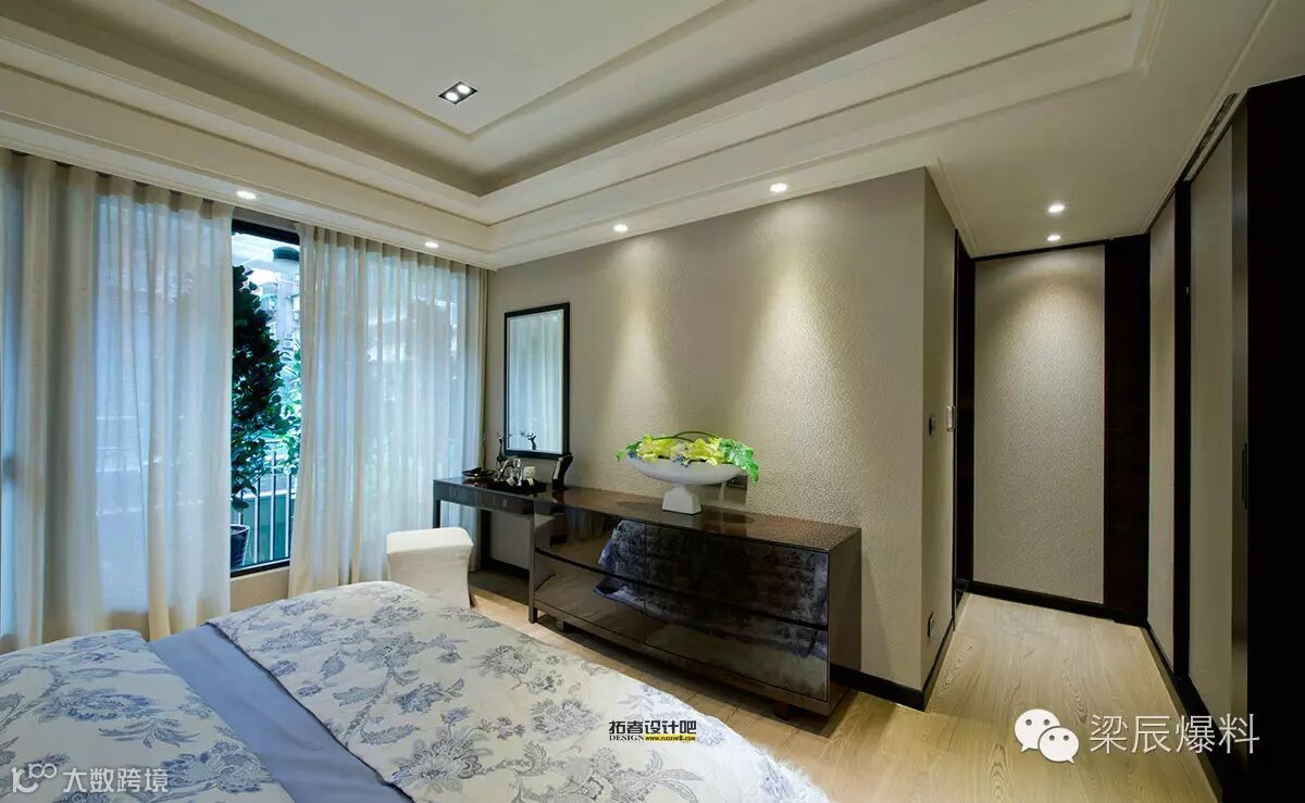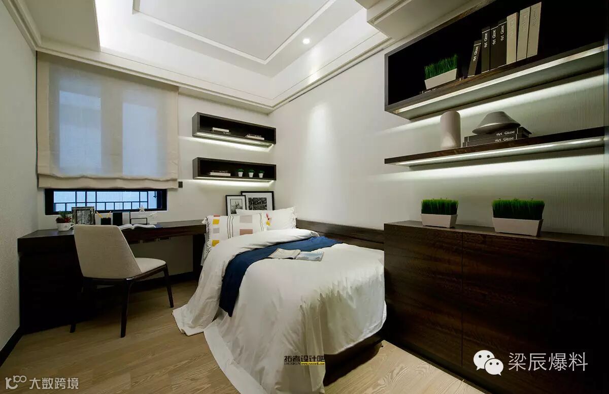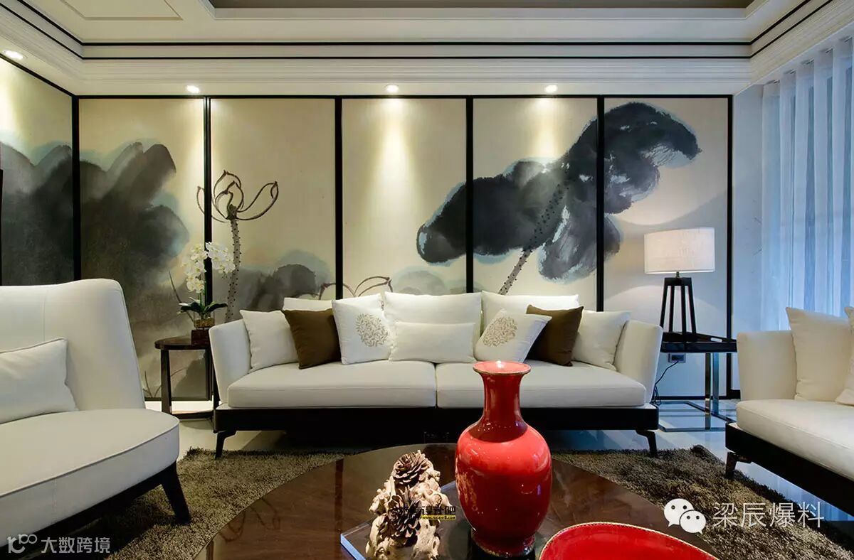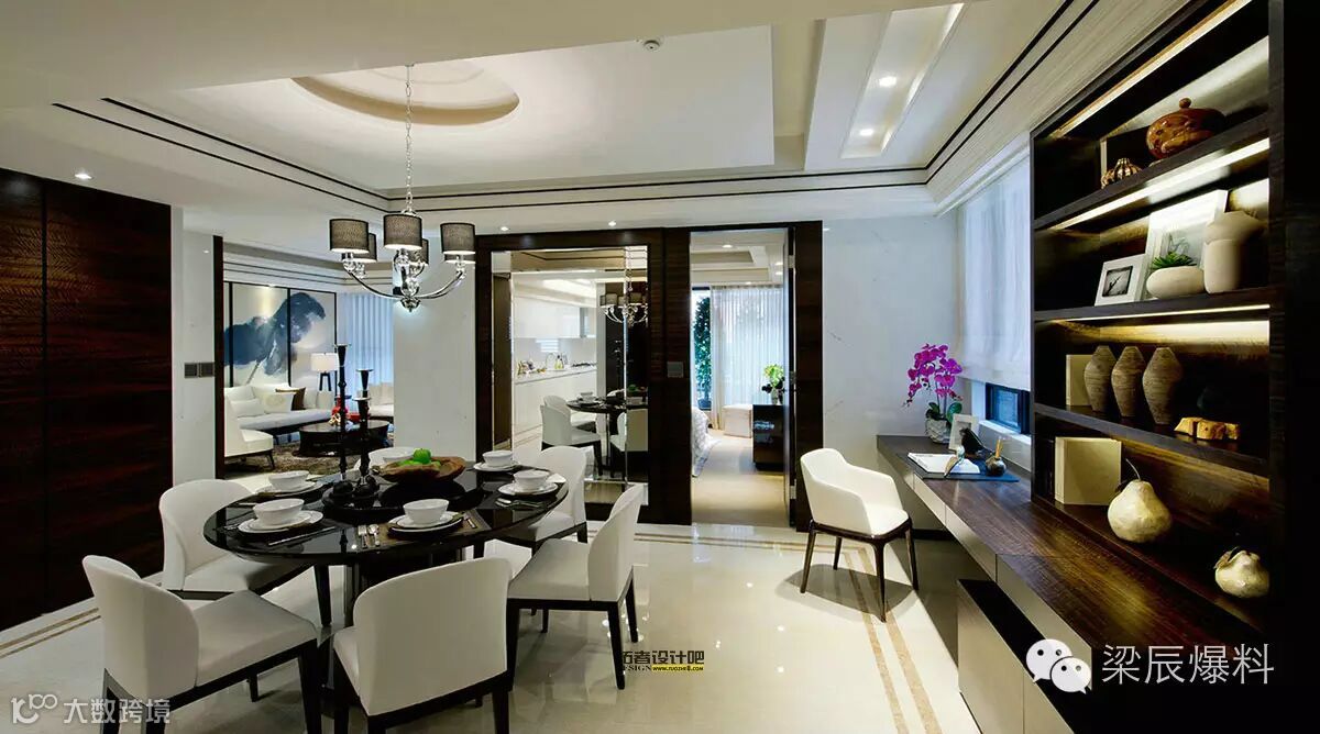 渐层内缩的黑白方框地坪,与水波纹向外扩散的端景墙线条,在鞋柜门片的镜射倒影中,放大玄关尺度,IS国际设计将擅长的石材艺术带入公共空间,纹理细緻的白色大理石墙包围客厅立面,藉此放大电视墙器度,延伸线条收在水墨莲荷的订製画作前,形塑艺文优雅气息。设计师并依循天花樑体处的黑色描边线条,在地坪处框以相同金色饰带与之呼应,并同样施作在餐厨区。隐藏在深色枫木水波木皮起伏线条内的私领域,加入木地板与高级壁布元素,场域的转圜,也藉由材质与色彩的跳接,有了公私领域不同的变化。
