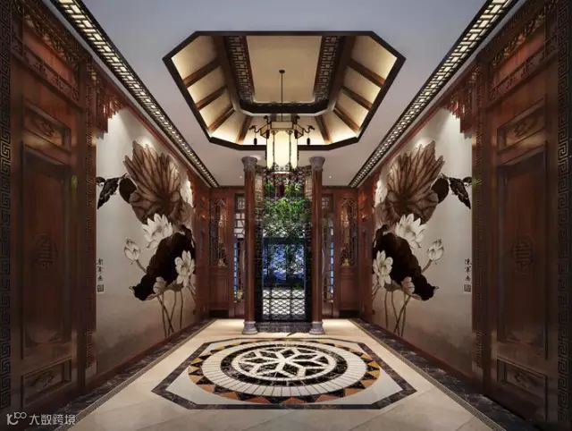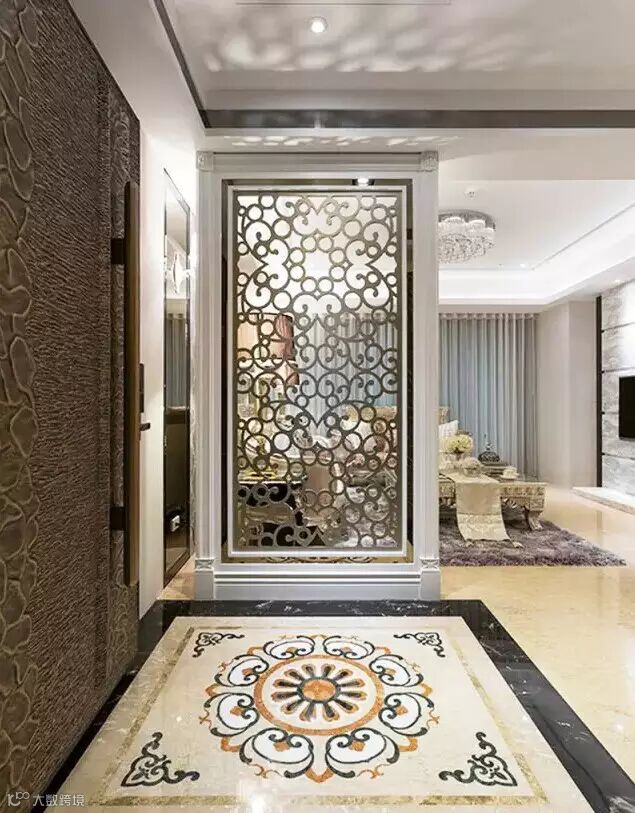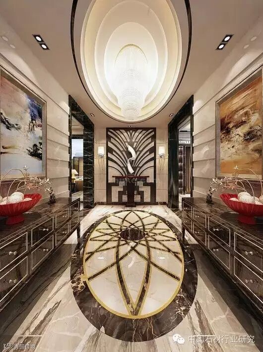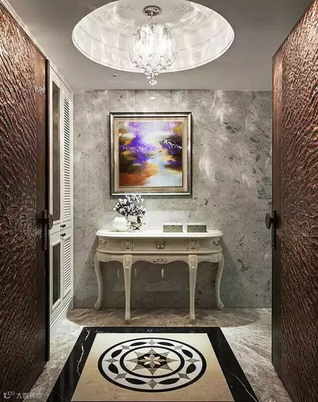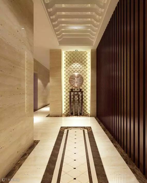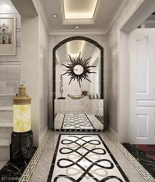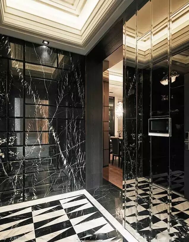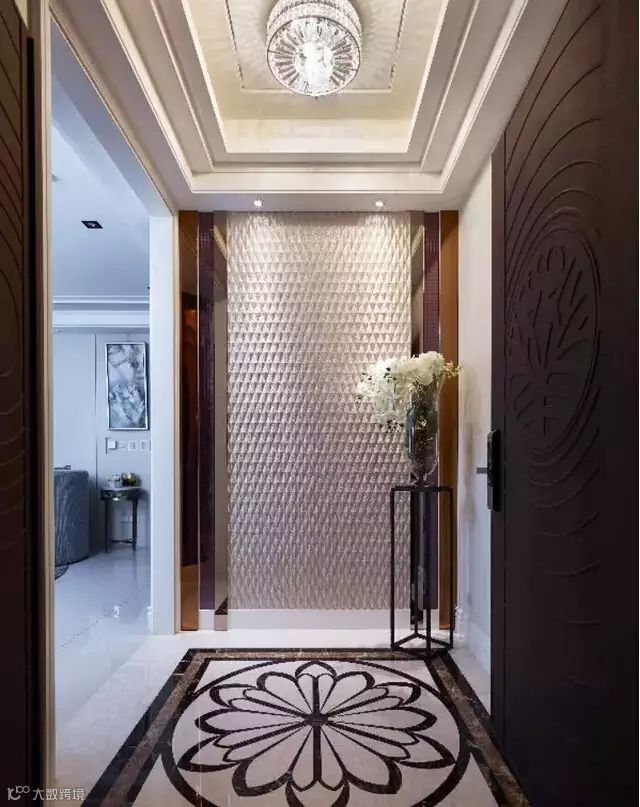 ▲石材拼花图案底板,搭配反射材质的立面,以及线条层层堆叠的天花板,让玄关大气恢弘。