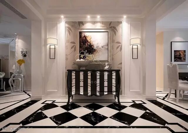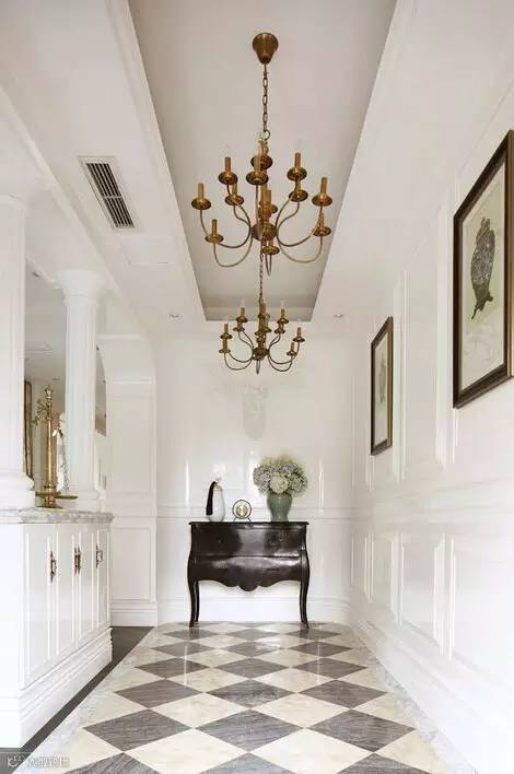 ▲璀璨的欧式花蕾吊灯,安放在玄关的中央,带来大气的感受。温馨的灯光、黑色的地砖与白色的家具搭配,有视觉上的对比,也有着从外到里的过渡。