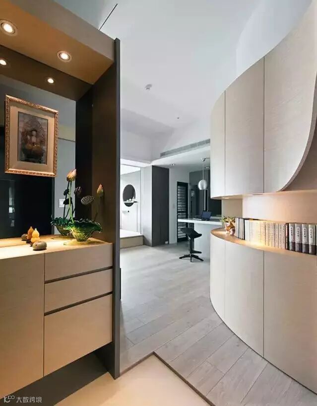▲玄关处,“S”造型的柜门设计有效规避了空间格局的弊端,而且让空间有一种曲径通幽的效果。