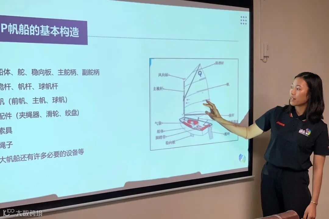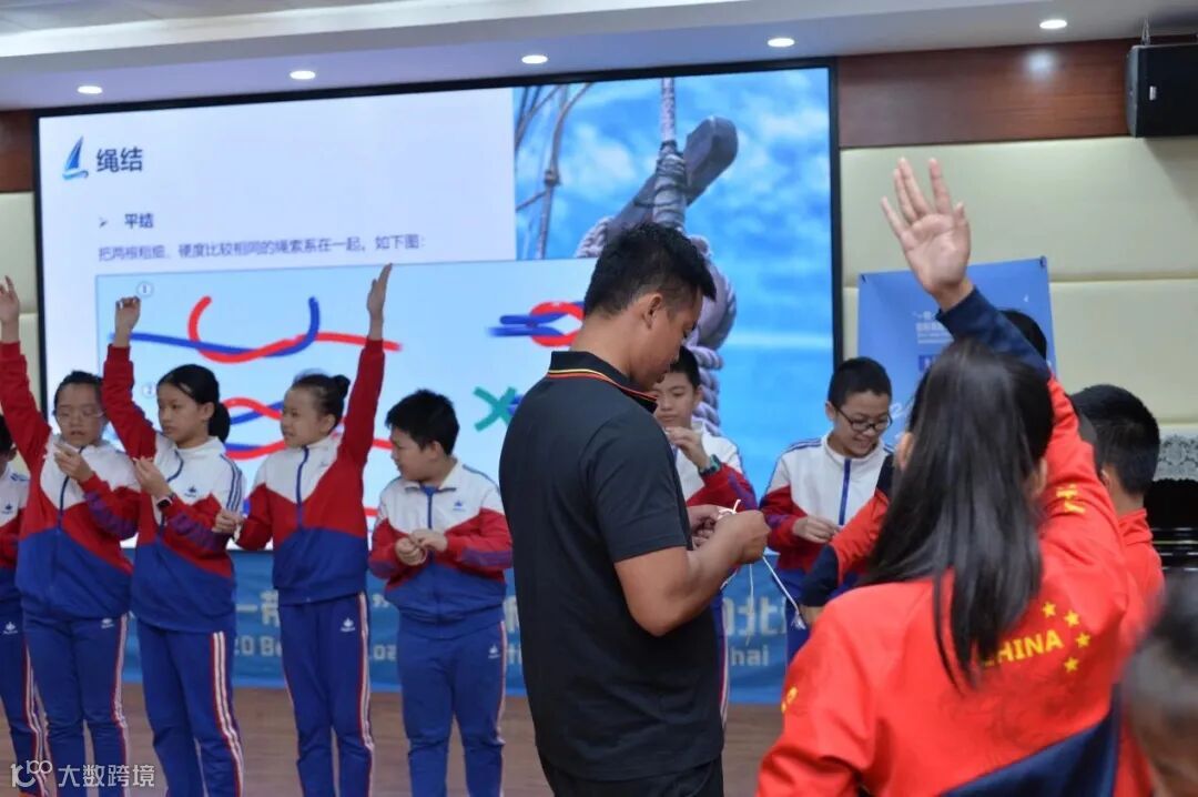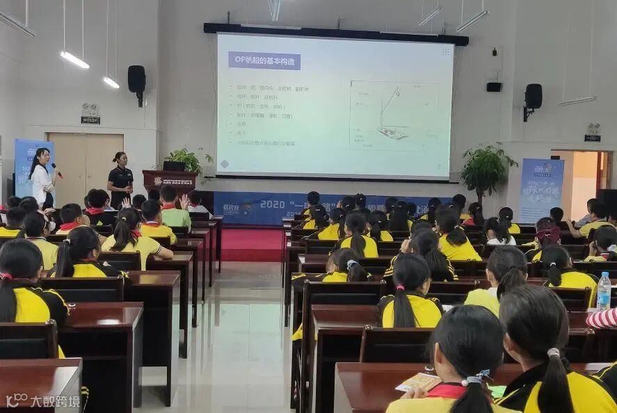 帆船进校园公益课堂以教授OP帆船运动知识为主,参与授课的有全国帆板冠军莫陈程、运动健将罗淦和冯青青三位教练。课堂上,教练员为同学们播放帆船运动影像,精彩刺激的海上竞技毫无意外地吸引了每所学校的同学们;讲授中国帆船运动简史,带领同学们了解中国帆船运动发展;科普帆船运动项目分类以及OP帆船的基本构造,开启趣味有奖问答环节,带领同学们走进帆船的世界;传授同学们帆船运动常用的结绳技巧,设置有趣的帆船绳结小竞赛让每一位同学都与OP帆船有一次亲身“接触”。