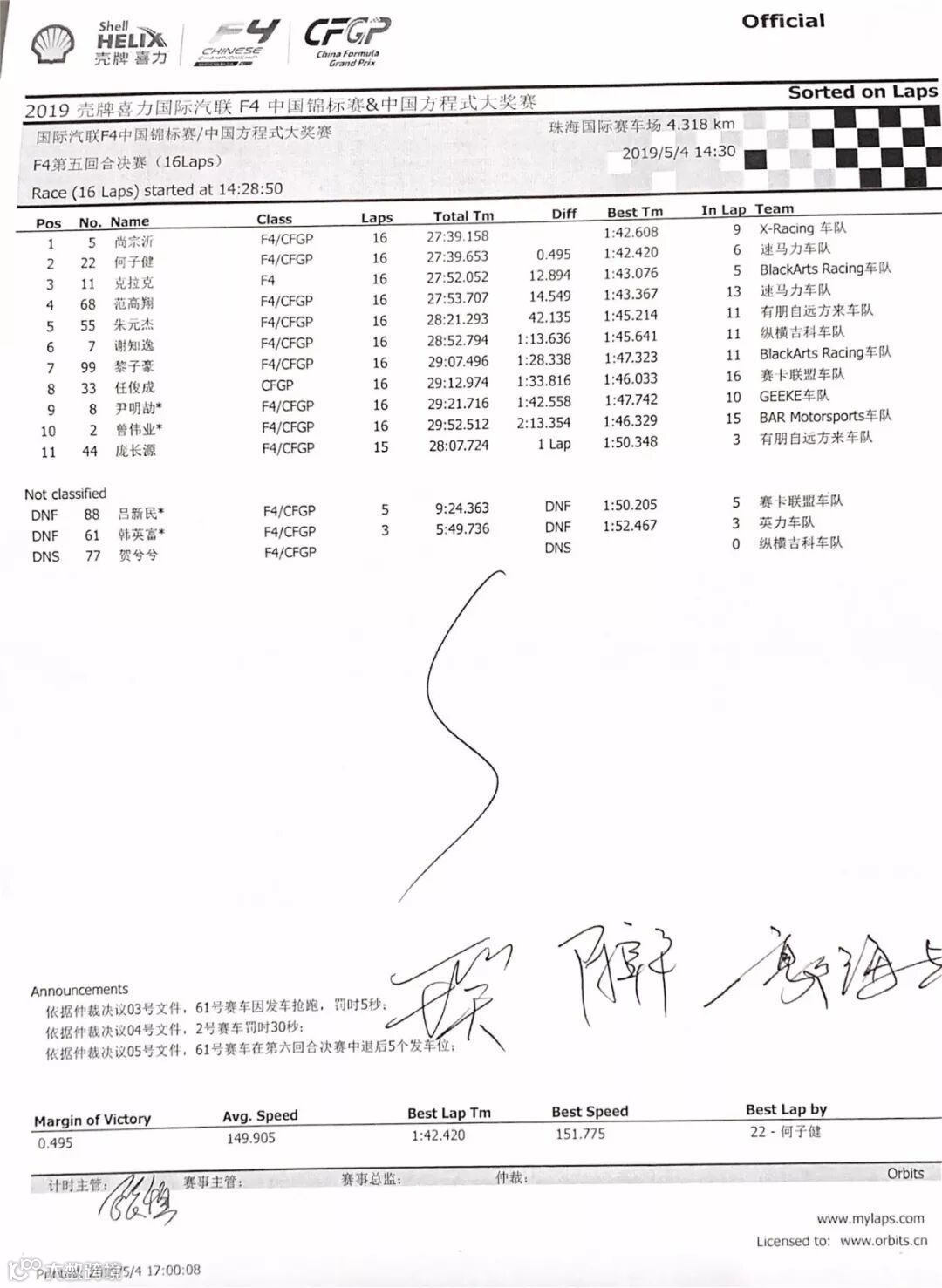 5月4日周六,是2019赛季壳牌喜力国际汽联F4中国锦标赛珠海站的决战日。在隆重的开幕仪式后,赛季总第五回合决赛一触即发。X-Racing车队尚宗沂从第八位出发,连连超车最终豪取冠军奖杯,速马力车队何子健为亚军,玄锋车队新西兰车手克拉克为本回合季军。
