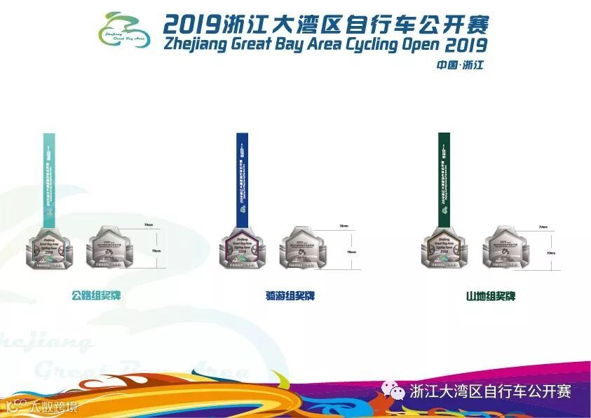 会上,2019浙江大湾区自行车公开赛赛事奖牌也得以公布。据孙晓东介绍,赛事奖牌分为公路组、骑游组、山地组三个组别,奖牌融入了”浙”拼音字母“Z”元素,与山川相互衬托,突出了大江大河、山川豪迈的大自然气息,紧扣“ 链动山水浙江、骑享诗画湾区 ”赛事主题。奖牌采用棱角分明的外轮廓,内融齿轮元素,与银色金属相互搭配体现骑行运动的力量感、高级感。在绶带颜色选择方面,公路组奖牌采用鲜艳灵动、春意盎然的湖蓝色进行搭配,体现公路骑行将会成为带动城市健康化、年轻化、多彩化的重要纽带;山地组别运用了符合森林形象特色的草绿色作为主色调,突出骑行者在森林山川中自由的穿梭自如,骑享诗画湾区最美篇章;而骑游组选取了更为深邃,宁静的海蓝色,作为链动山水浙江,创建碧海蓝天的的骑行力量。