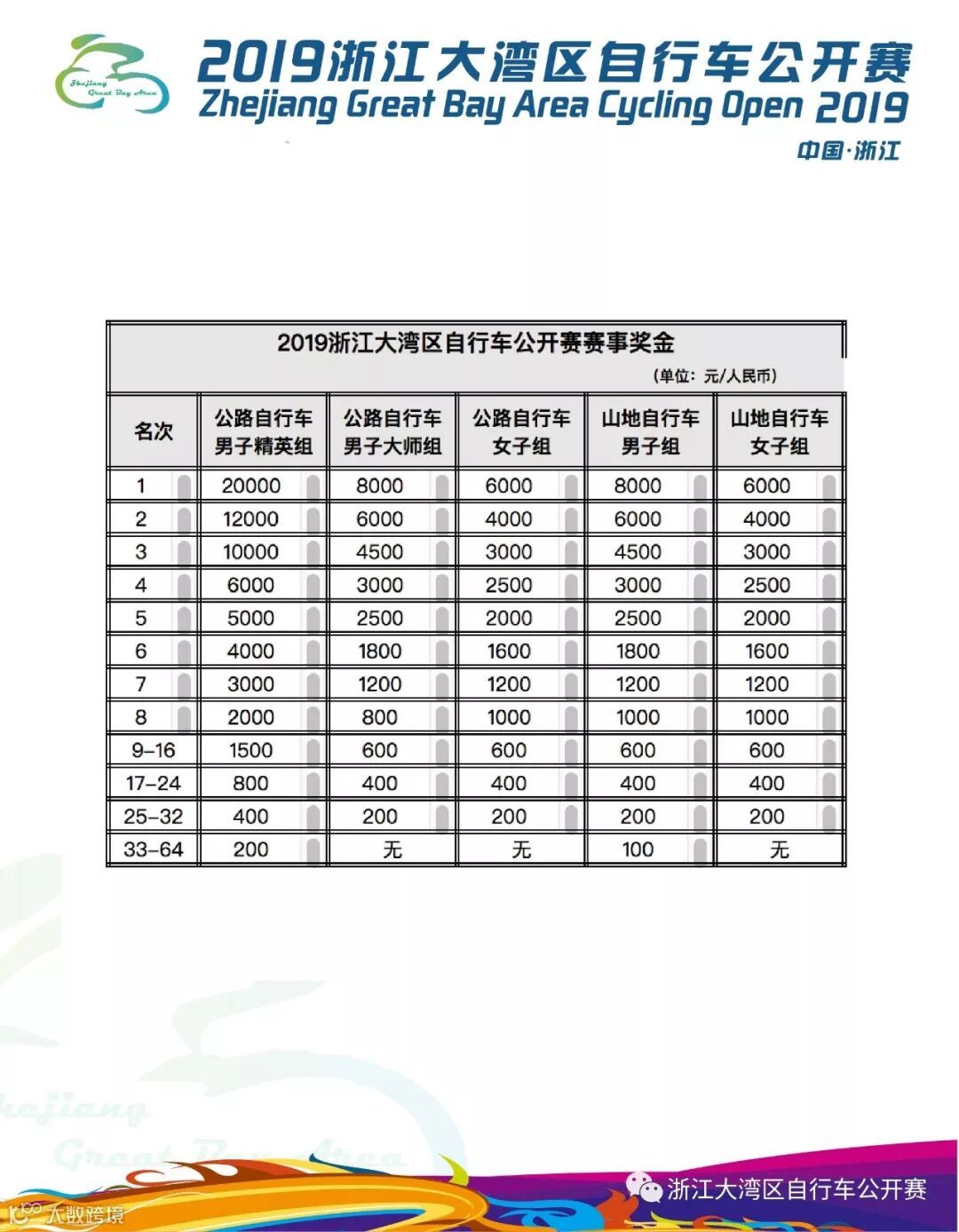 赛事奖金方面。杭州钱塘新区站、宁波慈溪站,比赛根据选手通过终点的先后顺序来决定名次,并获得相应奖金。公路自行车男子精英组、山地自行车男子组每组前64名均可获得奖金;公路自行车男子大师组、公路自行车女子组、山地自行车女子组中,则由每组前32名获得奖金;根据不同组别,冠、亚、季获奖运动员将赢得3000元至20000元不等的现金奖励。两站正赛奖金总额高达46万元。温州文成站、余姚四明山站骑游活动重在体验,不设奖金。