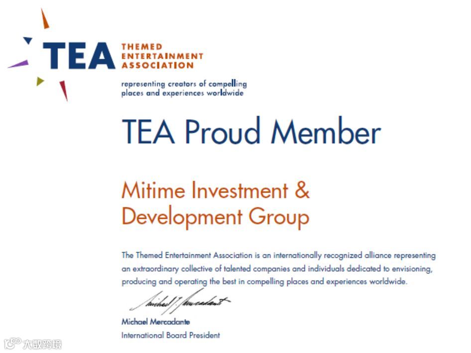据悉,全球主题娱乐协会(Themed Entertainment Association:TEA)是一家非营利性的国际联盟,组建于1991年,总部位于美国加利福尼亚州伯班克。协会拥有约7000名创意专家,包括建筑师、设计师、技术专家、规划大师、布景装配师、艺术家、施工专家、可行性分析师等,分布在39个不同国家的900多家公司,是全球主题娱乐行业最权威的机构。