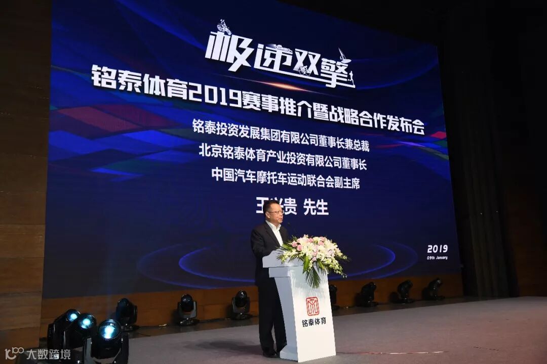 发布会最后,铭泰集团董事长兼总裁、铭泰体育董事长王兴贵发表致辞。王兴贵董事长指出:体育产业是铭泰集团重点发展的产业之一,铭泰体育从赛车运动起步,经过12年的默默耕耘,目前已经形成“综合体育,强劲赛车“的双驱发展的格局。2018年底国家颁布了《国务院办公厅关于加快发展体育竞赛表演产业的指导意见》,在国家政策的指引和鼓励下,铭泰集团更加坚定了发展体育产业的决心,未来铭泰体育将不断扩大经营规模,在中国体育产业中占据非常重要的一席之地,为中国体育产业的发展壮大贡献自己的力量。他期盼铭泰体育2019年继续创造更多快乐体验,并预祝所有来宾2019年新年新禧新气象,合作共享赢未来。