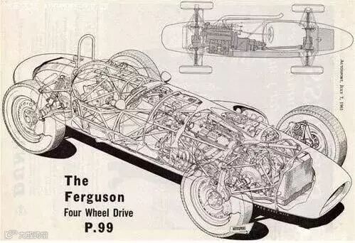 1961年,F1赛车上弗格森车队首席将四驱概念用在F1赛车上,Ferguson P99成为F1历史上第一辆四驱赛车,不过当时由于F1整体动力水平偏低,这套四驱系统最终成了摆设, Ferguson P99并没有给人留下什么成绩。