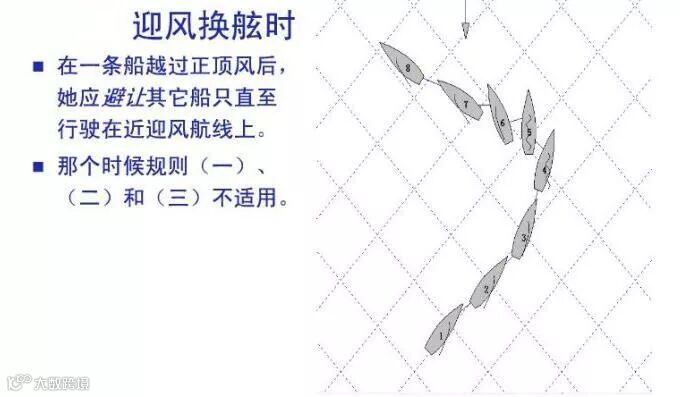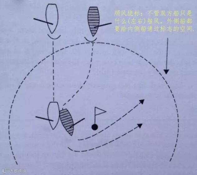 而在迎风绕标时,同舷风的船只,内侧和明显在前的船只在进入标区之前应当大声呼喊,提醒外侧船只和明显在后的船只给予足够的绕标空间。若两条相对舷风接近迎风标,则左舷风船只要避让右舷风船只