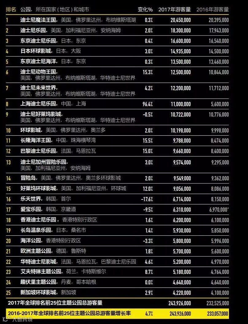 以上梳理出来旅游业的发展规律并不是中国独有的,其实全世界大都如此。看一下下图由TEA(主题娱乐协会)和AECOM(非常有名的做景观规划、乐园规划、市场咨询、产品模型的公司)列出的全球排名前25位的娱乐/主题公园,排名靠前的集中在美国、日本和欧洲一些国家。为什么?