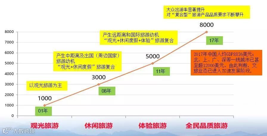 到去年,2017年,我国人均GDP达到8836美元,北上广深一线城市甚至超过12000美元,现在去高铁站、飞机场,可以看到人头攒动,直观上就能感知到大众出游率明显上升。当人均GDP到达8000美元时,复合型旅游变得更加复杂。比如以家庭为单位,可能不止一家三口,而是三代人一起出游,那旅游产品就必须能满足不同年龄段、不同文化程度消费者的不同需求,如孩子游玩需求、女士的购物需求,长辈的亲子需求等等。