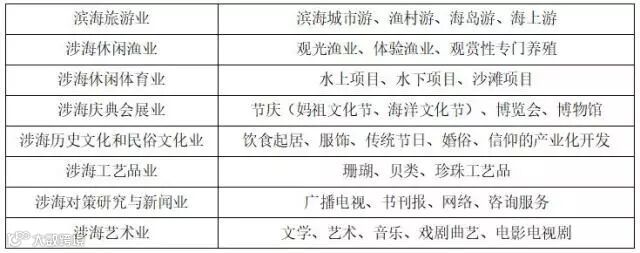 海洋文化产业是指“从事涉海文化产品生产和提供涉海文化服务的行业”。它包含的细分产业也非常繁杂。引用《广东海洋文化产业》一书中的分类,主要覆盖以下产业内容: