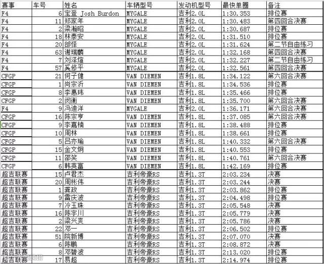 说起赛车运动,速度肯定是车迷关注的焦点。有个问题不知你们感兴趣不?就是赛车手的极限速度是多少呢?让我们来看看成都站的比赛中,各位车手的最快圈速吧!