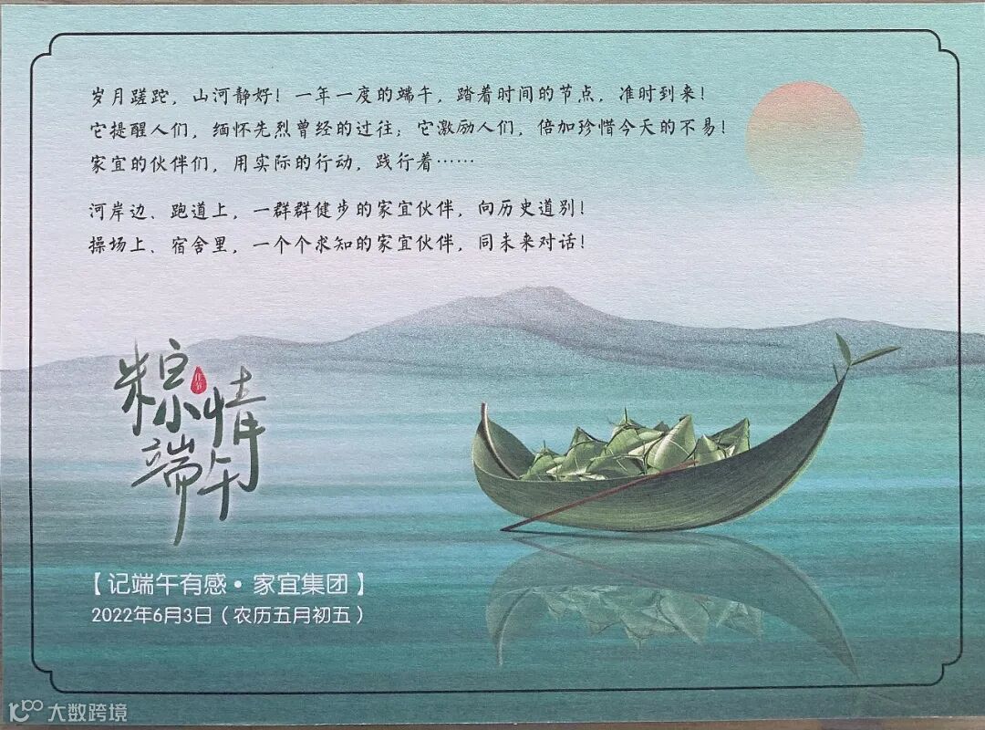 端午良辰临仲夏,不负光阴幸福时。感恩我们能在“家宜”相遇,愿你万事“粽”顺心,生活“粽”快乐,样样“粽”美好。