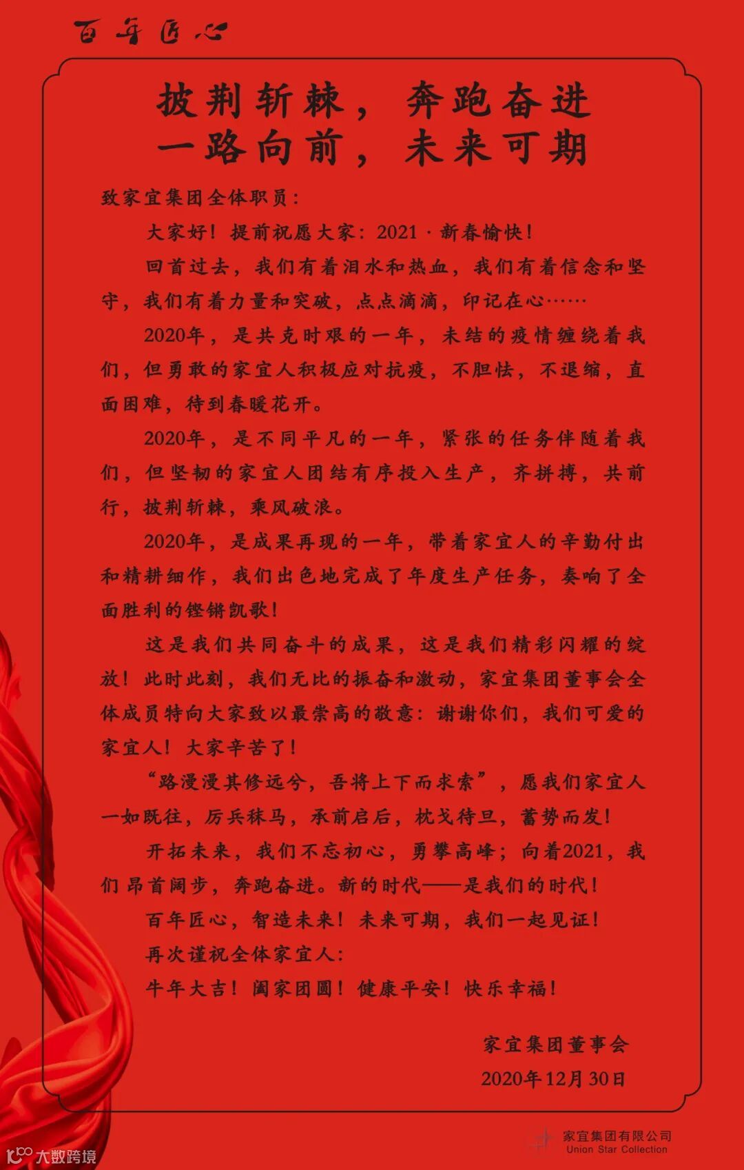 新一年的钟声即将敲响,值此,家宜集团董事会提前预祝全体家宜人: