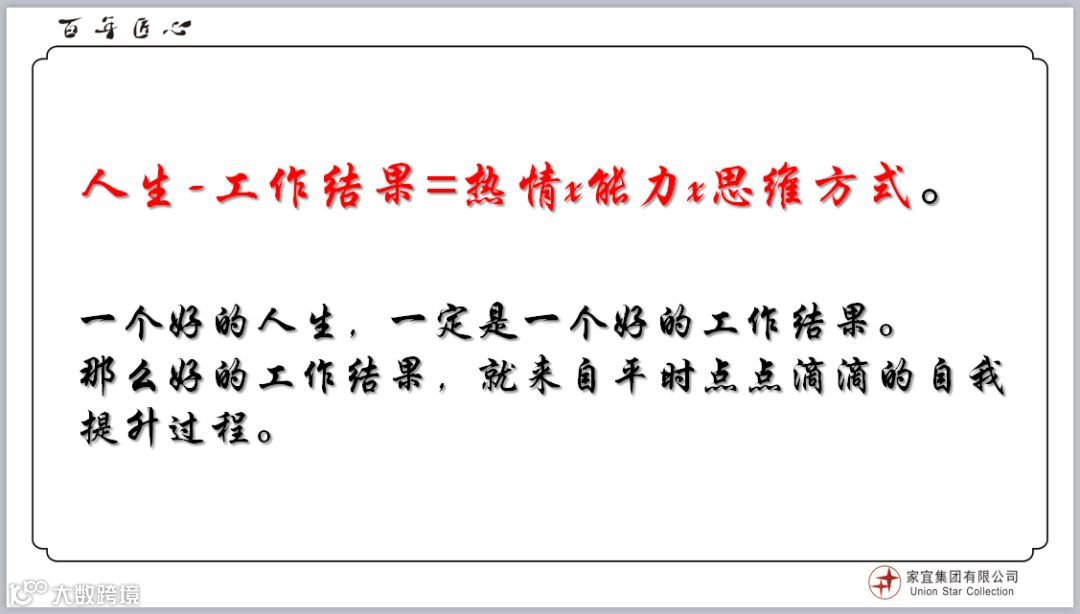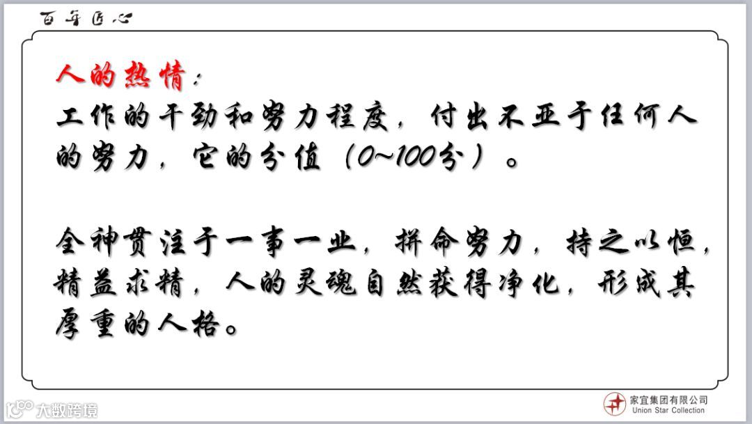 回到我们的企业团队,现阶段公司给我们定义的工作范围,其实只是每个人所应该做的最小范围。对公司、对工作、对生活有着冲劲热情和雄心壮志的职员,决不会将自己局限在固有的工作范围之内。