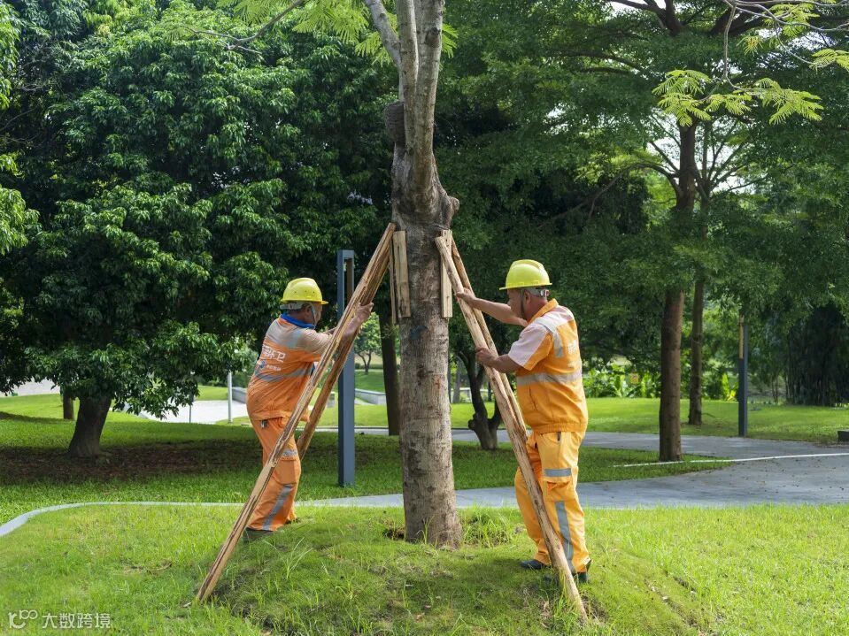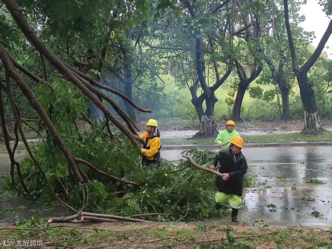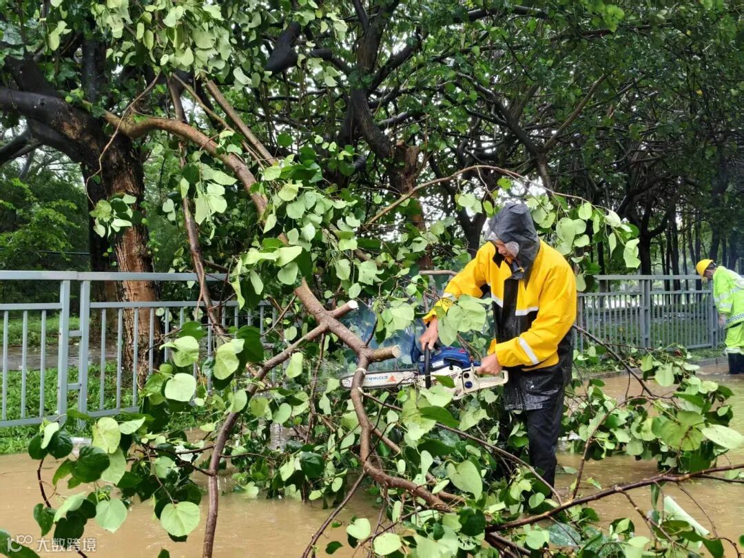 东实城服公司工作人员在对道路沿线存在倒伏风险的绿化树木进行疏枝、修剪、加固,进行重点加固与警戒。此外,城服公司全面落实公园闭园管理,在园区入口、江边沿岸等显著位置张贴闭园告示,安排工作人员现场劝离市民游客,确保人员安全撤离。