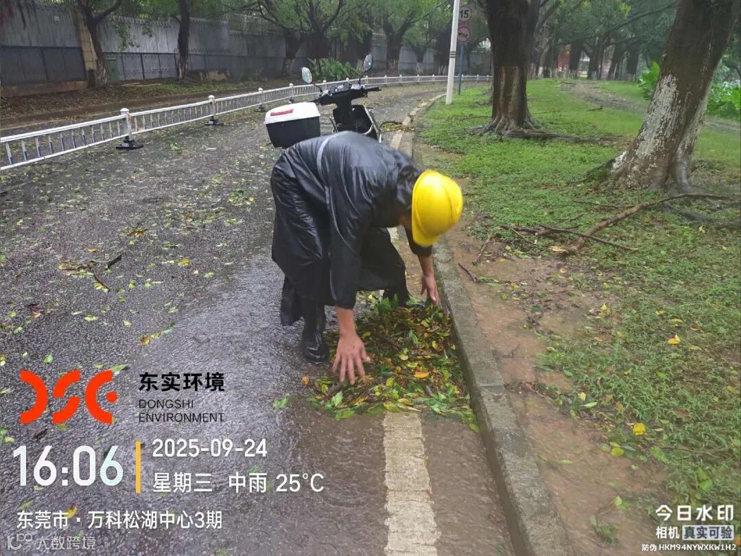 为加大清扫保洁力度,重点清理排水井口、雨水篦子,东实城服公司工作人员针对道路两侧绿化带、排水沟旁、墙角缝隙等易堆积杂物的区域,重点清除枯枝、塑料袋等易被台风裹挟的杂物,聚焦城市排水关键节点,进一步提升区域排涝能力。