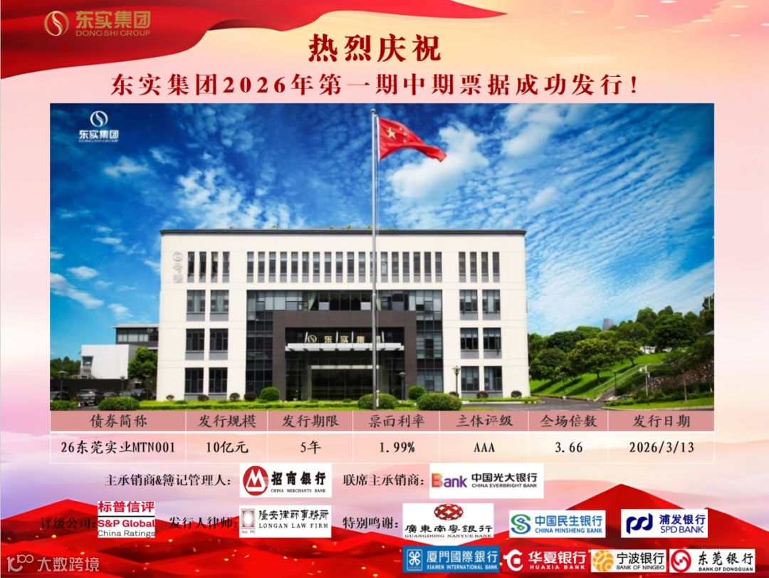 3月13日,东莞实业投资控股集团有限公司(以下简称“东实集团”)成功发行2026年第一期中期票据。本期发行规模10亿元,期限5年,票面利率低至1.99%,创下集团中长期债券发行利率历史新低。