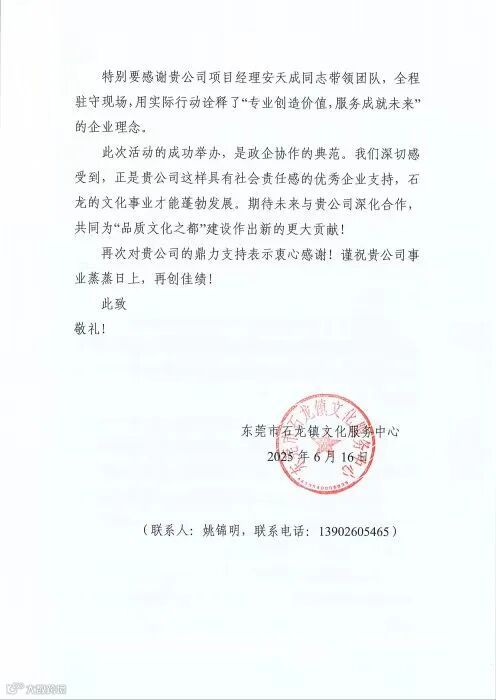 6月16日,东莞市石龙镇文化服务中心向东鸿物业驻举重博物馆物业管理处发来感谢信,高度认可东鸿物业团队在“文化和自然遗产日”主会场系列活动中的卓越表现。