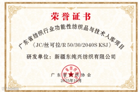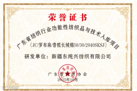 近日,东纯兴集团两款高端功能性纱线——“精棉/罗布麻/普梳长绒棉50/30/2040支赛络紧密纺针织纱”与“精棉/丝可拉/粘胶50/30/2040支赛络紧密纺针织纱”,成功入选广东省纺织行业功能性纺织品与技术入库项目,标志着集团在功能性纺织品研发与创新成果转化方面取得关键性突破。