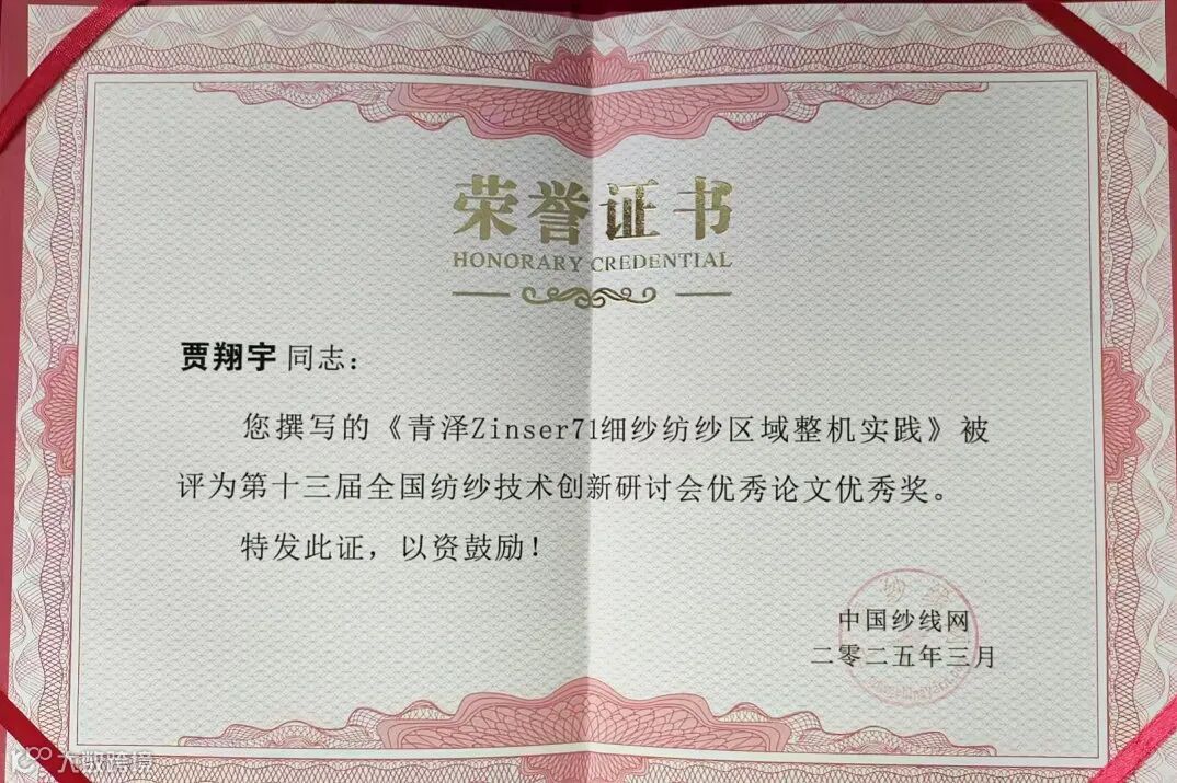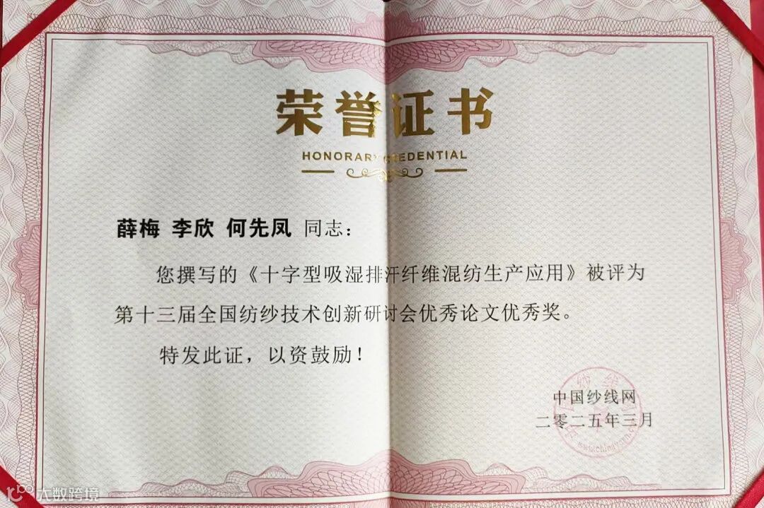 今年,东纯兴就企业去年下半年来的科研成果进行系统性总结,并向中国纱线网提交5篇论文。其中3篇论文——《十字型吸湿排汗纤维混纺生产应用》《精棉/索罗那/莱赛尔40/30/30混纺纱生产实践》《青泽Zinser71细纱纺纱区域整机实践》,在今年3月中旬举办的第十三届“锦峰杯”全国纺纱技术创新研讨会上获得“优秀奖”。