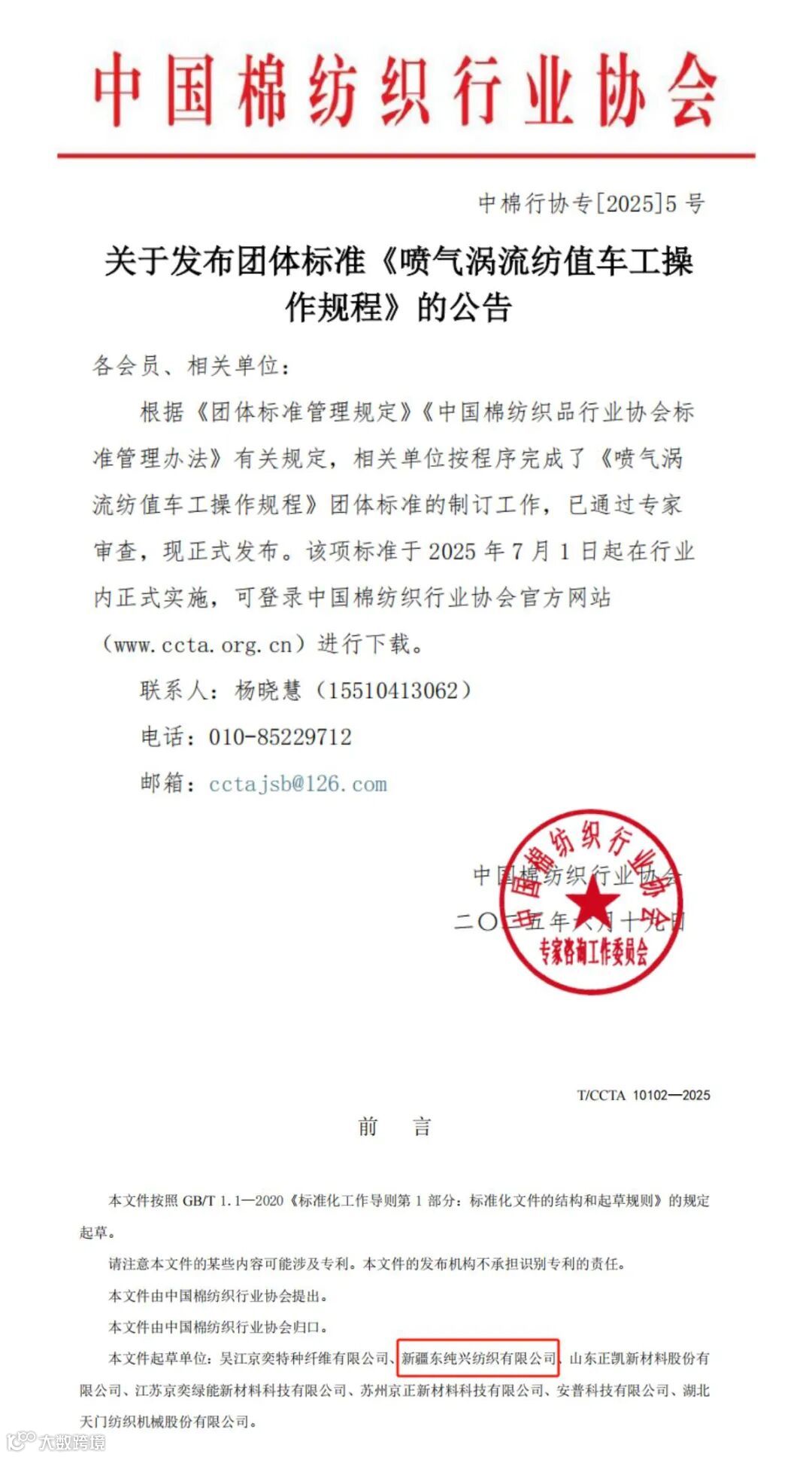 中国棉纺织行业协会于6月19日正式发布重要团体标准 T/CCTA 10102-2025《喷气涡流纺值车工操作规程》,该标准将于 2024年7月1日起正式实施。作为该标准的第二参编单位,新疆东纯兴纺织有限公司全程深度参与了标准的立项论证、起草编制及实践验证工作,为填补喷气涡流纺领域值车工操作规范的行业空白贡献了关键力量。