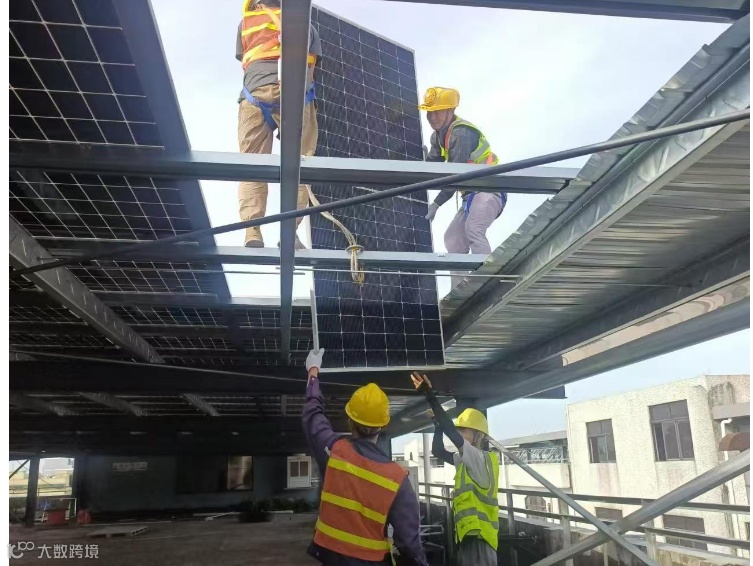 ▲东莞市欣健高分子科技有限公司分布式光伏发电项目现场,施工人员正在安装光伏板