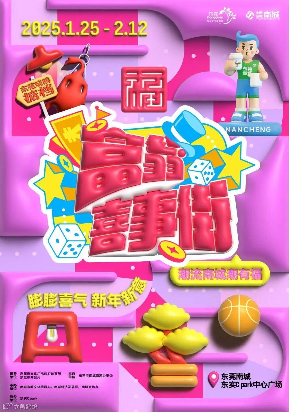 “富翁喜事街——食在南城膨胀展”在东实C park L1 中心广场举办,一个个巨大膨胀气模,充分展现咖啡、音乐、篮球等南城特色产业,如“福”看南城——南城摄影展、“蚝”运满满——蚝岗博物馆IP展示、东莞文创IP烧鹅掂档、广东省凳搭建的“万家凳火”、“篮球新春MVP”投篮互动装置、“潮流南城·City Walk”(南城游玩地图),可爱、吸睛又震撼,让人忍不住拍照打卡!