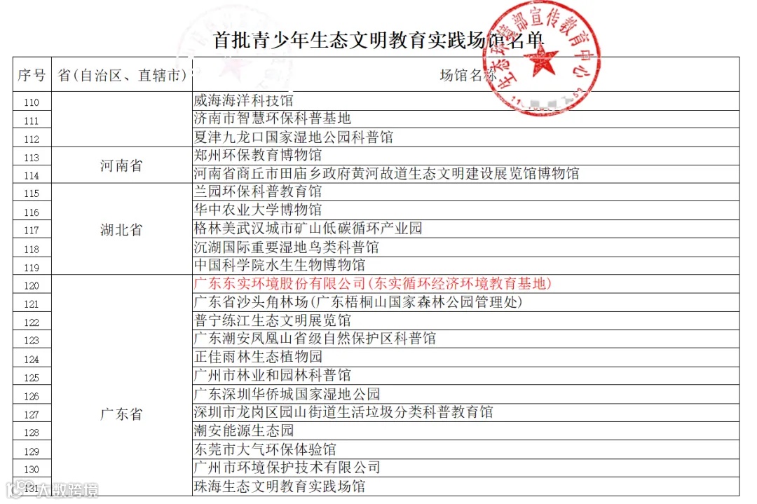 近日,生态环境部宣传教育中心公布了首批青少年生态文明教育实践场馆名单。广东东实环境股份有限公司(东实循环经济环境教育基地)获评“青少年生态文明教育实践场馆”。