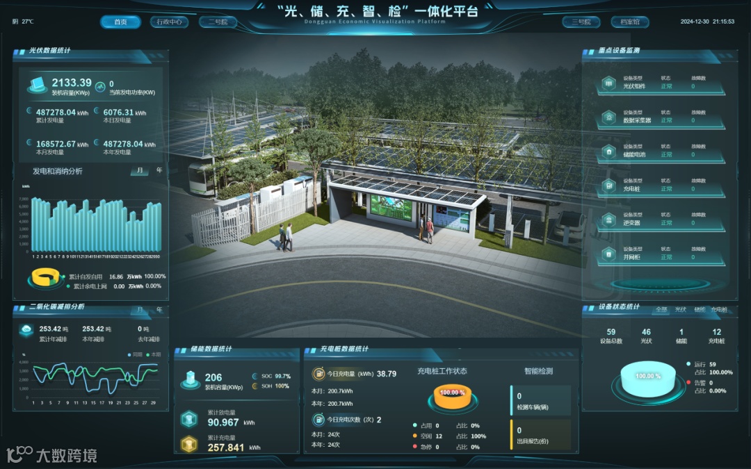即集光伏发电、储能系统、充电设施、智慧光储充电站管理平台以及智能检测功能五大模块为一体的智能综合系统。其中,智慧光储充电站管理平台通过运用云计算、AI等新一代数字化技术,对整个项目的光储充电量数据、设备状态实现可视化监控管理,实现机关能源资源及碳排放数据“可测、可视、可控”,为机关节能改造、节能管理提供高效的数据支撑。