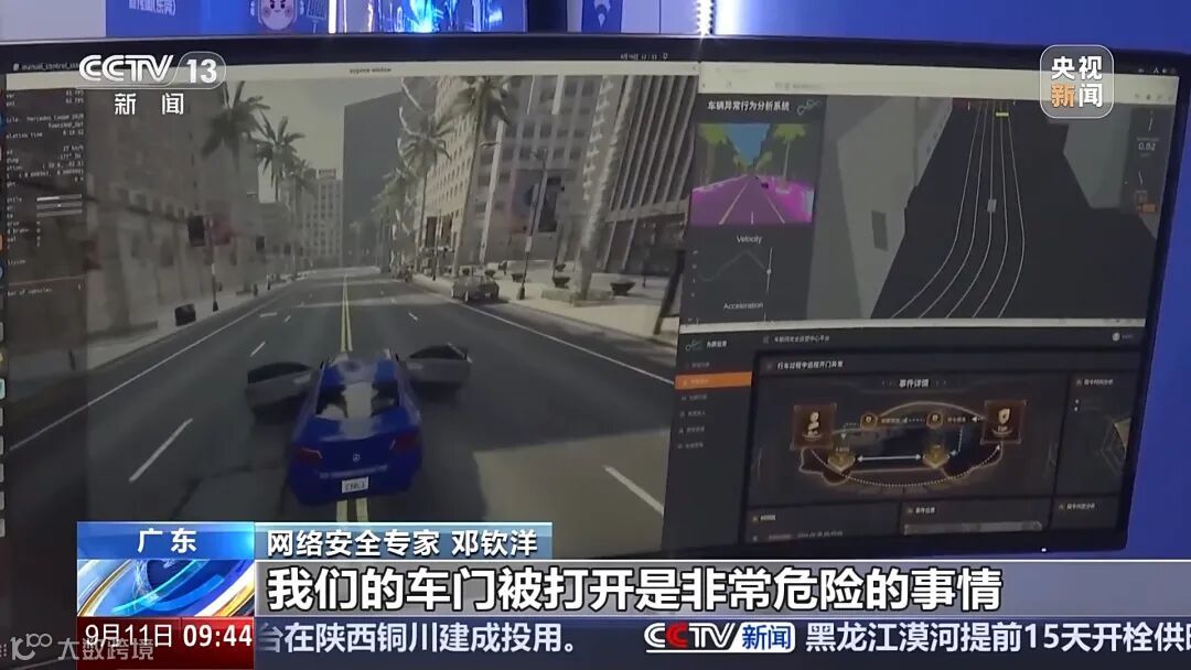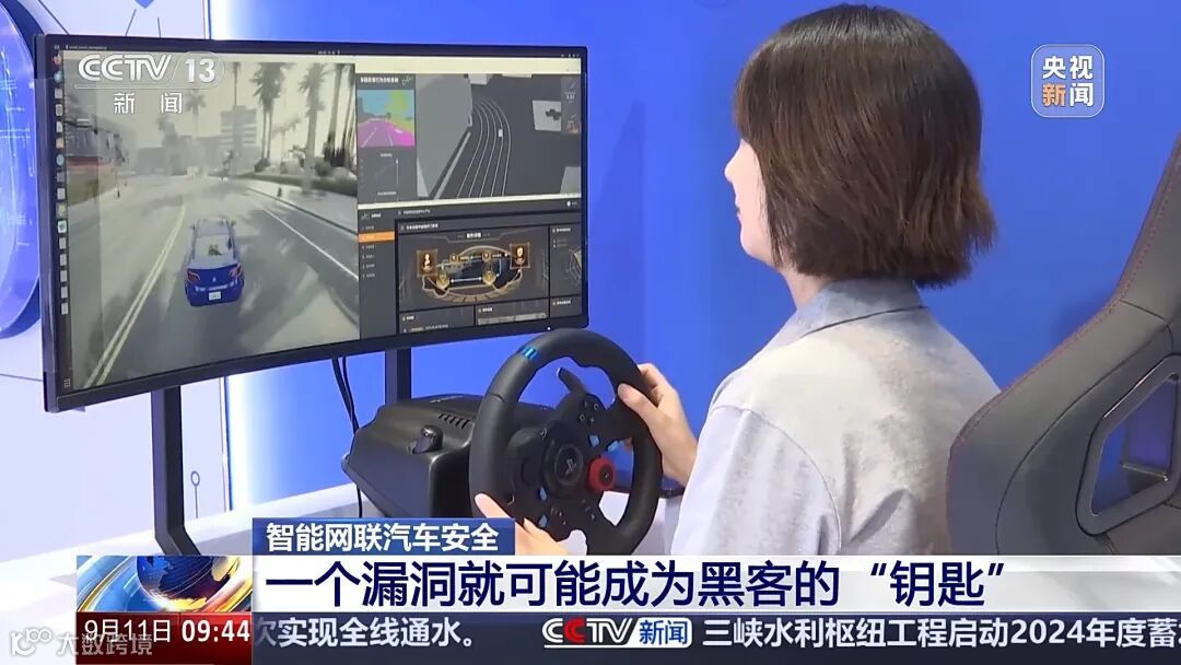 市民坐在“驾驶舱”,面前大屏幕还原路况场景。突然警报声响起,工作人员充当“黑客”对行驶的车辆展开攻击,车辆随即失去控制,车门打开。