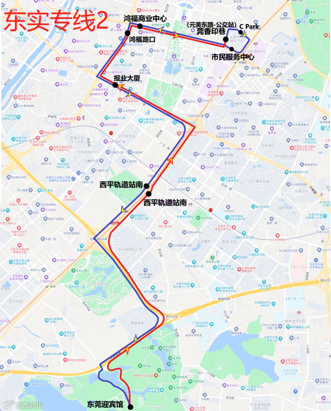 途经站点:东莞迎宾馆(迎宾馆正门)、西平轨道站南(公交站)、报业大厦(公交站)、鸿福路口(公交站)、鸿福商业中心(公交站)、莞香印巷(元美东路公交站)、C park(市民服务中心东北门)、市民服务中心(公交站)。