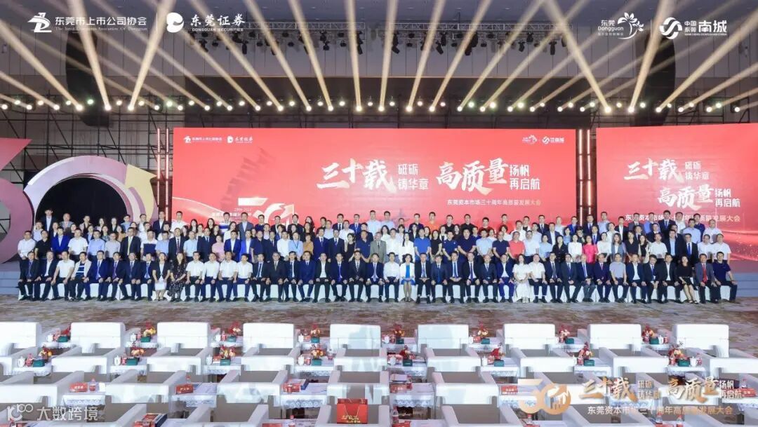 大会现场,来自政企媒学各界的代表济济一堂,共同庆祝东莞资本市场成立三十周年的重要时刻。东实集团党委书记、董事长彭光顺,总经济师毛羽受邀参加会议。