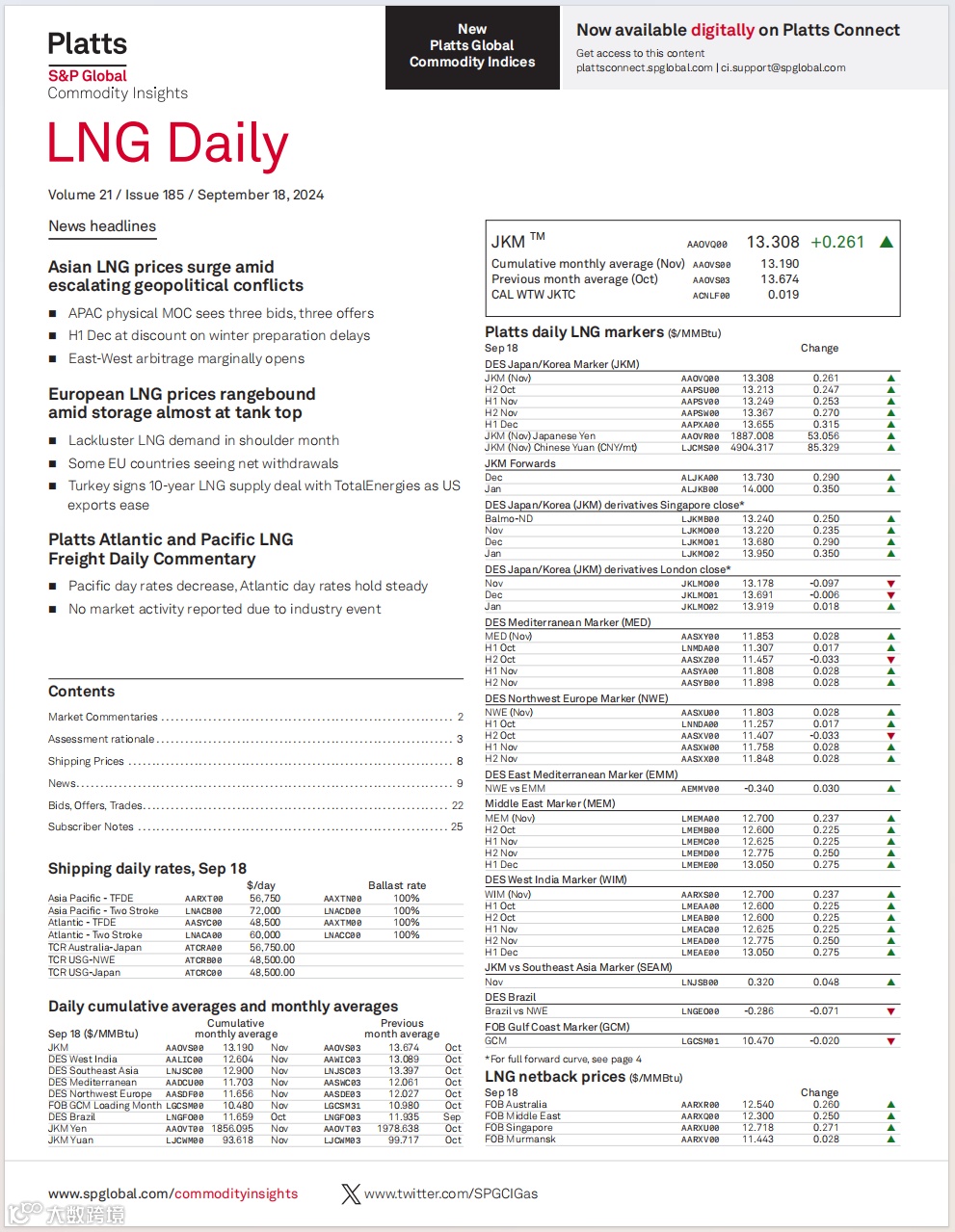 标准普尔全球普氏能源资讯(Platts S&P Global)作为全球领先的能源信息提供商,在能源领域有着举足轻重的地位,其客户涵盖190多个国家/地区逾12000家公私机构中的交易员、分析师、风险经理、采购人员和其他专业人士,遍布能源和金属供应链,包括电力与天然气公用事业企业、综合能源公司、输送管道运营商等。标普Platts每天发布资讯、评论、基础市场数据和分析,以及在现货市场和期货市场广泛作为基准价使用的每日估价,包括JKM(国际性天然气交易指数,目前该指数已经成为亚洲地区最具有代表性且最受关注的天然气交易指数之一,也已成为环球市场上的重要天然气价格参考)价格。客户根据标普Platts日报上的资讯和价格作为关键性贸易、投资和业务决策的参考依据。