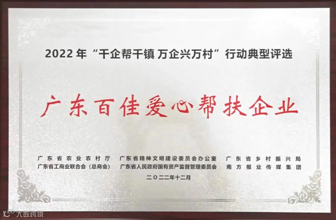 能源集团在2022年“千企帮千镇万企兴万村”行动典型评选中,获评“广东省百佳爱心企业”称号。