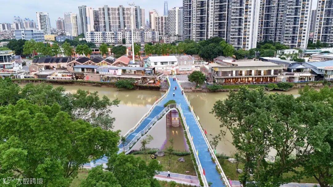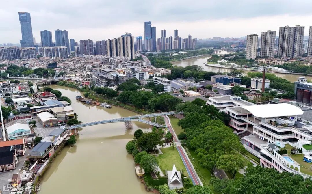 ▲鳒鱼洲文创园和近日竣工通行的鳒鱼洲跨厚街水道慢行桥
