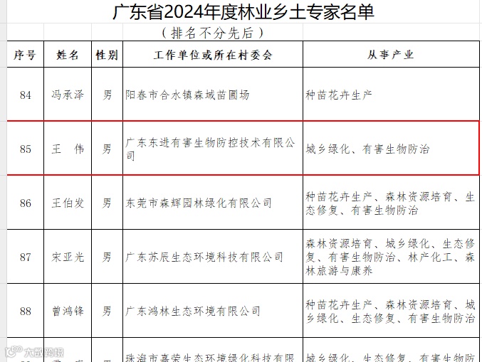 近日,省林业局公布广东省2024年度林业乡土专家评选结果,东鸿公司旗下实际控制企业东进公司王伟成功入选。本次共有101名林业乡土专家入选,东莞市共3人入选。