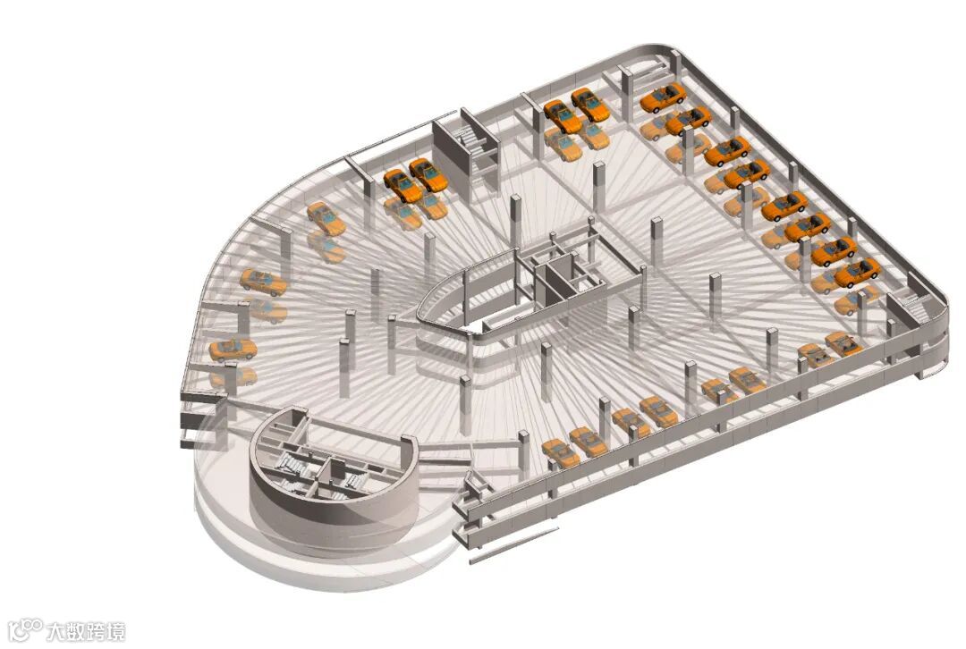 莞建公司总经理刘文念表示,这是一个极具特色的项目:“从停车功能的第三层至七层屋顶,每一层楼板都是螺旋上升的,也就是说,在停车楼内部层与层之间是没有分界的,与螺旋上升飘带外立面在功能上完全统一,取消了楼层之间车行坡道,提高停车效率。这一点在整个大湾区都是独一无二的!”
