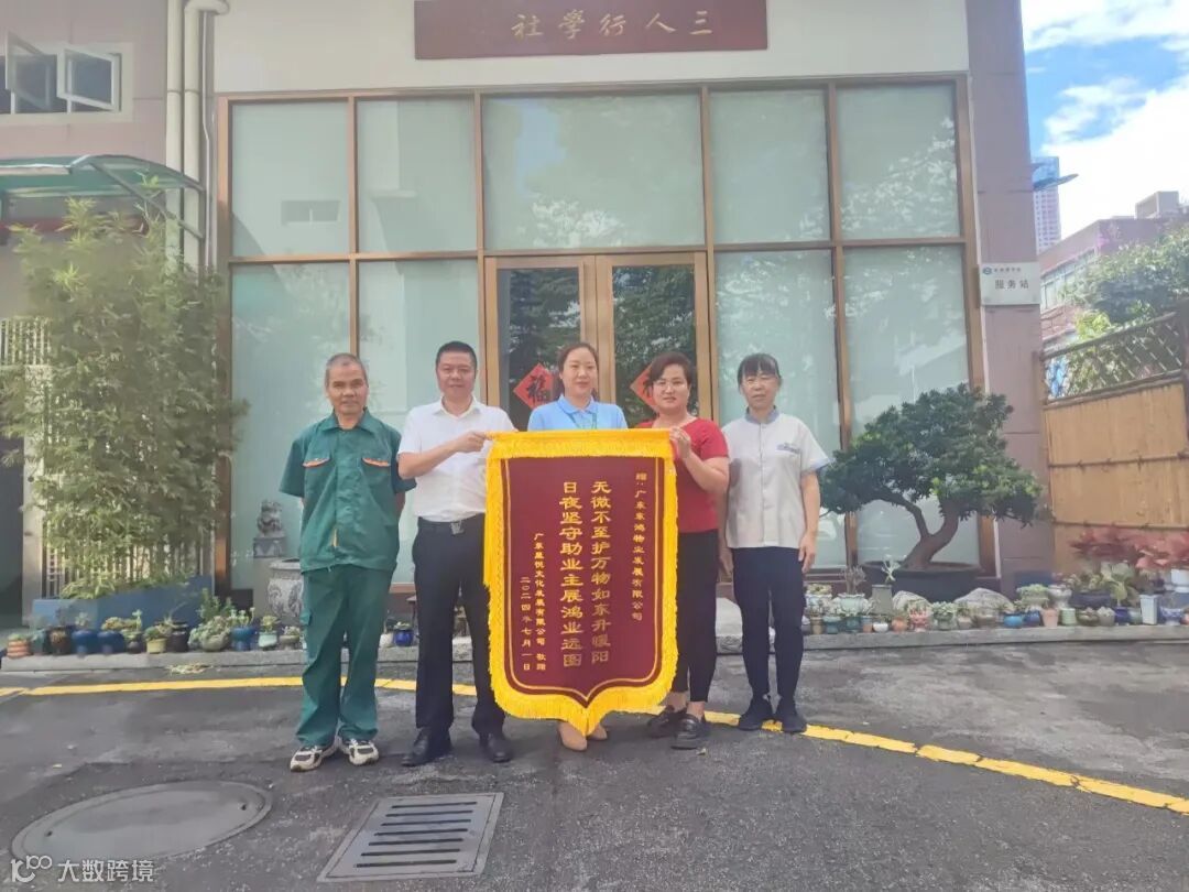 “南城大院物业服务中心工作人员优质、高效、贴心的服务,以及认真负责的工作态度,都让我们深受感动……”7月16日,广东星悦文化发展有限公司给南城大院物业服务中心送来一面锦旗,上面绣着“无微不至护万物如东升暖阳,日夜坚守助业主展鸿业远图”24个金色大字,表达了星悦文化公司对南城大院物业服务中心员工的高度赞赏。