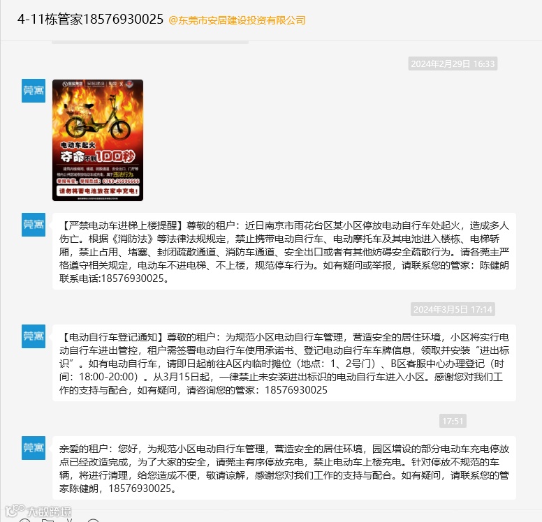 将电动车“请到户外”,只是莞寓诸多服务升级措施的其中之一,目的是为了住户在莞寓住得安心、舒心。不仅如此,为了在住户心里筑起安全“防火墙”,莞寓持续通过小区宣传栏、通过管家微信、微信公众号等方式,科普用电安全、燃气安全、电动车使用以及消防安全等知识,提高住户对消防安全的关注度和认知。